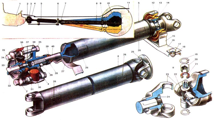 | Крутящий момент от вторичного вала коробки передач на механизмы заднего моста передается карданной передачей, которая работает в условиях изменяющегося угла передачи крутящего момента вследствие эластичной подвески заднего моста. При этом одновременно изменяется и расстояние между неподвижно закрепленной коробкой передач и качающимся задним мостом. Поэтому в карданной передаче имеются элементы, укорачивающие или удлиняющие ее, а также изламывающиеся на определенный угол. Такими элементами являются: шлицевое соединение эластичной муфты 3 и три карданных шарнира - два жестких 7 и 9, один эластичный 3. Карданная передача двухвальная с промежуточной опорой 6, что значительно уменьшает ее вибрацию и биение. Между собой и шестерней главной передачи карданные валы соединены жесткими карданными шарнирами 7 и 9, а с вторичным валом коробки передач эластичным шарниром (муфтой) 3. Эластичная муфта значительно снижает шум и вибрации карданной передачи и допускает передачу крутящего момента под углом. Муфта состоит из шести резиновых элементов 30, между которыми расположены металлические вкладыши 31. Упругие резиновые элементы муфты привулканизированы к вкладышам и составляют единое целое. Эластичная муфта расположена между двумя фланцами 2 и 4, которые соединены с муфтой болтами 35. При этом выступы вкладышей заходят в пазы фланцев, центрируя эластичную муфту на фланцах. На болты крепления муфты навернуты самоконтрящиеся гайки с нейлоновыми вставками. Чтобы обеспечить беззазорное соединение муфты с фланцами и создать постоянный натяг в болтах крепления, отверстия в эластичной муфте под болты крепления выполнены от центра на большем диаметре, чем во фланцах. Поэтому прежде чем соединять муфту с фланцами, ее сжимают специальным хомутом до совпадения отверстий в муфте и фланцах, а затем устанавливают болты крепления. Этот же хомут используется и при снятии муфты. Передний карданный вал 5 изготовлен из тонкостенной трубы, к торцам которой приварены шлицевые наконечники. На шлицах переднего наконечника 40 расположен фланец 4 эластичной муфты. Задний наконечник опирается на шариковый подшипник 14 промежуточной опоры 6. Подшипник расположен в стальном корпусе 13 и зафиксирован в нем стопорным кольцом. На валу подшипник зажат гайкой 24 между буртиком наконечника и вилкой 23 карданного шарнира. Подшипник закрытого типа, с уплотнителями, которые надежно удерживают в нем заложенную при сборке смазку. Дополнительно подшипник защищен двумя грязеотражателями. Для поглощения вибраций карданной передачи корпус подшипника расположен в резиновой подушке 12, которая привулканизирована к металлическим поверхностям корпуса 13 подшипника и кронштейна 15 промежуточной опоры. Конфигурация подушки такова, что передний карданный вал может иметь некоторое осевое перемещение. Кронштейн 15 промежуточной опоры крепится к поперечине двумя болтами с гайками, а поперечина промежуточной опоры закреплена на двух болтах, приваренных к полу кузова. На болты крепления установлены металлические дистанционные втулки 17 и резиновые втулки 18, которые изолируют поперечину от пола кузова. Для безопасности движения автомобиля под передним карданным валом установлен кронштейн 27 безопасности, не допускающий падение вала при разрушении эластичной муфты. Задний ка