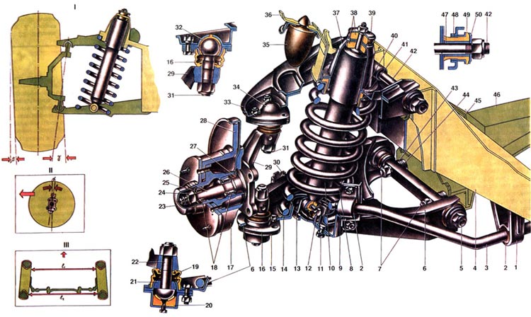 | Связывающим звеном между колесами и кузовом являются передняя и задняя подвески автомобиля. Через них передаются на кузов силы, действующие на колеса. Элементы, входящие в подвески, смягчают нагрузки, уменьшают колебания кузова, обеспечивают хорошую устойчивость и плавность хода автомобиля. К этим элементам относятся направляющее устройство, упругие элементы, амортизаторы и стабилизатор поперечной устойчивости. Направляющее устройство подвески определяет характер движения колеса относительно дороги и кузова и передает силы и моменты от колеса к кузову. К этому устройству относятся верхний 33 и нижний 6 рычаги подвески и шарнирно связанный с ними поворотный кулак 29. Верхний рычаг соединен осью 42 со стойкой передка кузова при помощи резинометаллических шарниров. Ось, выполненная в виде болта с шестигранной головкой, проходит через проушины рычага 33 и через втулку стойки передка кузова. В проушины верхнего рычага запрессованы резинометаллические шарниры, каждый из которых состоит из резиновой втулки 49, запрессованной между внутренней 47 и наружной 48 металлическими втулками с большим натягом. Наружная втулка 48 запрессована в проушину верхнего рычага, а внутренняя 47 насажена на ось 42. Шарнир зажат на оси гайкой между полкой верхнего рычага и упорной шайбой 50. Качание верхнего рычага происходит в пределах деформации резиновой втулки 49. Резиновая втулка не должна проскальзывать относительно металлических втулок или шарнира на оси и в рычаге. Такая конструкция шарнира обеспечивает плотное соединение оси с рычагом подвески. К верхнему рычагу подвески тремя болтами крепится шаровая опора 34 неразъемной конструкции. В корпусе опоры расположен подшипник 32, основа которого - смола, а поверхность трения - тефлоновая ткань, плотно облегающая сферическую поверхность пальца 31. Детали шаровой опоры защищены от загрязнения резиновым армированным чехлом 19. Палец 31 установлен в коническое отверстие поворотного кулака 29 и закреплен самоконтрящейся гайкой. Нижний рычаг 6 подвешен на оси 5, которая двумя болтами 7 крепится к поперечине 46 подвески. Последняя крепится к лонжеронам кузова. Между осью и поперечиной установлены дистанционная 44 и регулировочные 43 шайбы. Изменением количества шайб 43 регулируют продольный угол (наклона оси поворота и угол развала) передних колес.' Резинометаллические шарниры нижнего рычага такой же конструкции, как и верхнего, отличаются только размерами и формой втулок. Снизу к рычагу подвески тремя болтами крепится нижняя шаровая опора. Ее конструкция отличается от верхней опоры. В корпусе опоры расположен палец 22 с полусферической головкой. На стержень пальца надет подшипник 21 с полусферической поверхностью. В нижнюю часть корпуса вставлен с натягом вкладыш 20, изготовленный из маслостойкой резины. На его поверхности, контактирующей с полусферой пальца 22, привулканизирован пластмассовый слой (смесь нейлона с сульфидом молибдена). За счет резинового вкладыша выбираются зазоры между деталями шаровой опоры, а подшипник 21 поджимается к полусферической поверхности верхней части корпуса опоры. Снизу в корпусе опоры имеется отверстие, через которое смазывается шарнир. Оно закрывается конической пробкой. Детали шаровой опоры защищены от загрязнения защитным чехлом 19. Нижняя шаровая опора соединена с по