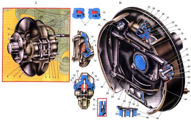 | Тормозные механизмы колес смонтированы непосредственно в колесах автомобиля. Они предназначены для создания сопротивления движению автомобиля. Тормозной механизм переднего колеса дисковый. Он состоит из суппорта 5 а сборе с рабочими цилиндрами 12, двух тормозных колодок 4, пальцев 8 крепления колодок и трубопроводов. Суппорт отлит из высокопрочного чугуна. Он крепится к фланцу поворотного кулака вместе с защитным кожухом 7 и поворотным рычагом. В суппорте выполнены радиусный паз для размещения тормозного диска и два поперечных паза, в которых расположены тормозные колодки. В приливах суппорта имеются два окна с направляющими пазами, в которых установлены два противолежащих колесных цилиндра 12. Точное расположение цилиндров относительно суппорта обеспечивается пружинными фиксаторами 16. При установке цилиндра в паз суппорта фиксатор под действием пружины заходит в специальный боковой паз суппорта. Корпус рабочего цилиндра 12 отлит из алюминиевого сплава. В цилиндре расположен стальной полый поршень И, уплотнений резиновым кольцом 13. Оно расположено в канавке цилиндра и служит не только для уплотнения зазора, но и для возврата поршня в исходное положение при растормаживании. Полость цилиндра защищена от загрязнения резиновым колпачком 15, наружная кромка которого удерживается на буртике цилиндра, а внутренняя кромка охватывает посадочный поясок поршня. Рабочие полости цилиндров соединены между собой трубкой 10. Во внешний цилиндр ввернут штуцер 9 для прокачки привода передних тормозов, во внутренний - штуцер для подвода жидкости. Поршни 11 упираются в тормозные колодки 4, на которые наклеены фрикционные накладки. Колодки установлены на направляющих пальцах 8, которые удерживаются от осевого смещения шплинтами 2, а чтобы не было вибраций колодок на пальцах, применяются пружины 3, прижимающие колодки к пальцам. Под головки пальцев установлены пружины 1. При торможении поршни под давлением жидкости выдвигаются из колесных цилиндров и увлекают за собой уплотнительные кольца 13, которые при этом скручиваются. При растормаживании, когда давление в приводе падает, поршни за счет упругой деформации колец 13 вдвигаются обратно в цилиндры. При этом накладки 14 тормозных колодок будут находиться в легком соприкосновении с тормозным диском. При износе накладок, когда зазор в тормозном механизме увеличивается, в приводе создается большее давление жидкости, чтобы создать тормозной момент. Под действием давления жидкости поршни 11 проскальзывают относительно колец 13 и занимают новое положение в цилиндрах, которое обеспечивает оптимальный зазор между диском и колодками. Тормозной* механизм заднего колеса барабанный, смонтирован на опорном щите 45, который крепится болтами к фланцу балки заднего моста. К нижней части щита двумя заклепками 17 крепится пакет пластин, из которых пластина 46 является опорной для колодок 20, а пластины 19 ограничивают осевое перемещение нижней части колодок. Внутренняя изогнутая пластина ограничивает перемещение троса 21 в сторону щита. В верхней части щита 45 крепится двумя болтами колесный цилиндр 27. Снаружи в резьбовое отверстие цилиндра ввернуты штуцер 29 для прокачки привода тормозов и штуцер 30 трубки подвода жидкости в цилиндр. С обеих сторон в цилиндр установлены поршни 32 с уплотнительными кольцами