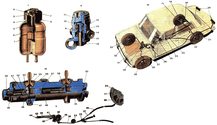 | Рабочая тормозная система имеет двухконтурный раздельный гидравлический привод на тормозные механизмы передних и задних колес, что значительно повышает безопасность движения автомобиля. При отказе одного из контуров, другой используется в качестве запасной тормозной системы. т. е. она является частью рабочей тормозной системы. Гидравлический привод включает в себя тормозную педаль 27. главный цилиндр 30 гидропривода тормозов, бачок 31, регулятор 19 "давления задних тормозов, колесные (рабочие) цилиндры тормозных механизмов, трубопроводы и шланги. Педаль 14 тормоза подвешена к кронштейну 3 совместно с педалью сцепления при помощи оси 7. В ступице педали установлены разрезные пластмассовые втулки 8. через которые проходит внутренняя металлическая втулка 4. Относительно этой втулки поворачивается педаль тормоза. Педаль шарнирно соединена с толкателем и в исходное положение возвращается усилием оттяжной -пружины 9. В этом положении упор педали упирается в буфер выключателя 26 стоп-сигнала. Главный цилиндр 30 гидропривода тормозов крепится на двух шпильках к щитку передка кузова. Сверху в его корпусе выполнены три резьбовых отверстия для штуцеров трубопроводов, отводящих жидкость в контуры привода передних и задних тормозов, и два гнезда, в которых крепятся стопорными шайбами штуцеры 54, соединенные шлангами с бачком гидропривода тормозов. Внутреннее цилиндрическое отверстие цилиндра обработано с большой точностью и высокой чистотой поверхности. С одной стороны полость цилиндра закрыта резьбовой пробкой 50. В цилиндре последовательно установлены два поршня, один из которых приводит в действие задние тормоза, другой - передние. Между пробкой и поршнем 48, а также между поршнями 48 и 45 установлены возвратные пружины 46, под действием которых они возвращаются в исходное положение при растормаживании. При этом ход поршней в цилиндре ограничен винтами 47, хвостовики которых заходят в продольные пазы поршней. Поршень 48 привода задних тормозов уплотнен в цилиндре двумя кольцами 53. Переднее кольцо пружиной 52 поджато к торцевой поверхности канавки. Другой конец пружины упирается в тарелку 51. Заднее кольцо поджато к торцу поршня пружиной 46 через шайбу57. Поршень 45 привода передних тормозов имеет аналогичное уплотнение, только заднее кольцо расположено в канавке поршня и имеет другую форму. На обеих поршнях свободно надеты распорные втулки 58. В исходном положении поршня распорная втулка. упираясь в стопорный винт, отводит уплотнительное кольцо от торца канавки. При этом через образовавшийся зазор рабочая полость цилиндра сообщается с бачком гидропривода тормозов. Канавка переднего уплотнительного кольца через радиальное отверстие и осевой канал в поршне сообщается с рабочей полостью цилиндра. Поэтому, когда в рабочей полости увеличивается давление жидкости, уплотни- тельное кольцо плотнее прижимается к зеркалу цилиндра. Последовательное расположение поршней в цилиндре обеспечивает раздельный привод передних и задних тормозов. Бачок гидроцилиндра двухсекционный, изготовлен из полупрозрачной пластмассы, что обеспечивает визуальный контроль за уровнем жидкости. В нижней части корпуса бачка имеется два наконечника для подсоединения шлангов. На заливную горловину бачка навернута крышка 8. которая поджимает корпус 7 клеммного у