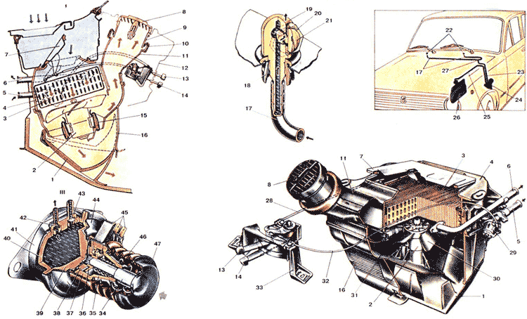 | Вентиляция, отопление и обдув ветрового стекла осуществляется воздухом, всасываемым снаружи. Отопление салона обеспечивается воздухом, подогреваемым в радиаторе 3 отопителя, который включен в систему охлаждения двигателя. Воздух отопления (на схеме работы отопителя показан стрелками) поступает через решетку капота автомобиля в коробку воздухопритока, расположенную под капотом в задней части передка кузова. От попадания задымленного воздуха из моторного отсека коробка воздухопритока герметизируется резиновым уплотнителем, поджимаемым к внутренней панели капота. Воздух в коробке резко меняет направление движения и поступает через люк, закрываемый крышкой 7 воздухопритока. в кожух 4 радиатора отопителя. При этом дождевая вода отделяется от воздуха и стекает из коробки воздухопритока по пластмассовой трубке через моторный отсек наружу. Крышкой 7 воздухопритока регулируют количество воздуха, поступающего в салон через радиатор отопителя. Пластмассовый кожух 4 радиатора крепится на четырех шпильках к усилителю щитка передка под коробкой воздухопритока, доступ к которому возможен под панелью приборов. Кожух радиатора с коробкой воздухопритока герметизируются уплотнительной прокладкой. В кожухе 4 установлен радиатор 3 отопителя и герметизирован по периметру резиновой прокладкой. Правый бачок радиатора разделен резиновой перегородкой на две полости. К бачку болтами крепится отводящая труба 6 и кран 29 с подводящей трубой 5. Концы труб выходят в моторный отсек через щиток передка и соединяются шлангами с системой охлаждения двигателя. Выход труб в моторный отсек герметизируется резиновым уплотнителем, который крепится к щитку передка двумя болтами. Воздух из радиатора 3 поступает в направляющий кожух и кожух 16 вентилятора. Направляющий кожух установлен между кожухами радиатора и вентилятора. Крепление осуществляется пружинными скобами к кожуху радиатора. В центре пластмассового направляющего кожуха с помощью пружинных скоб на двух эластичных подушках установлен электродвигатель 2 с крыльчаткой 30 вентилятора. На внутренней стенке кожуха крепится дополнительное сопротивление (резистор) 31, подключение и отключение которого в цепь электродвигателя производится трехпозиционным переключателем на панели приборов. Дополнительный резистор обеспечивает малую и большую скорости вращения вентилятора. Из кожуха вентилятора воздух поднимается через окно направляющего кожуха в воздухопровод И и далее через трубы 9 и поворотные дефлекторы 8 подается на ветровое стекло или непосредственно в салон на пассажиров. Трубы дефлектора с воздухопроводом уплотнены резиновыми уплотнителями 10. Снизу кожуха вентилятора на скобах шарнирно установлена воздухораспределительная крышка 1, при открывании которой воздух направляется к ногам пассажиров. При этом количество воздуха, поступающего к дефлекторам, уменьшается. Управление отопителем осуществляется переключателем электродвигателя вентилятора, поворотными дефлекторами и двумя рукоятками рычагов 14 и 13 управления крышкой воздухопритока и краном отопителя. Верхняя рукоятка 13 управления краном отопителя соединена гибкой тягой 32 с рычагом крана и регулирует количество охлаждающей жидкости, поступающей из системы охлаждения в радиатор отопителя. Нижняя рукоятка 14 соед
