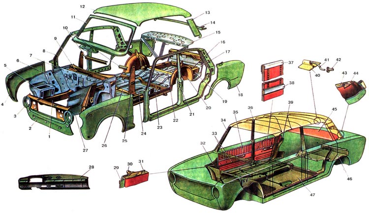 | Кузов автомобиля типа "седан", металлический, Цельносварной, несущей конструкции, четырехдверный Петли дверей расположены спереди. Замки дверей и фиксаторы безопасного типа. Окна дверей с двумя стеклами: у передних дверей одно стекло поворотное. Переднее и заднее окна имеют панорамные стекла. Ветровое стекло трехслойное, полированное; заднее - полированное, закаленное. Все стекла безопасного типа. Выступающие части интерьера салона выполнены безопасными (ручки, рычаги, противосолнечные козырьки и другие детали). (наружные поверхности кузова не имеют резких граней и выступов. Для обеспечения безопасности во время движения автомобиля от случайного открывания капот открывается вперед по ходу движения. Наружное и внутреннее зеркала заднего вида обеспечивают водителю хорошую обзорность: внутреннее зеркало снабжено устройством против ослепления водителя от света фар сзади идущего автомобиля. Внутреннее оборудование салона не отвлекает внимание водителя, в поле его зрения отсутствуют блестящие детали, слепящие лампы и блики от контрольных приборов; поворотные мягкие козырьки над ветровым стеклом защищают глаза водителя от слепящих солнечных лучей. Замки дверей выдерживают большие нагрузки и не позволяют дверям открываться самопроизвольно при ударе автомобиля о препятствие. Комфортабельное регулируемое сиденье, хорошая термошумоизоляция кузова, высокоэффективная система отопления, приточная вентиляция салона - все это резко снижает утомляемость водителя. Жесткость кузова подобрана таким образом, чтобы при наезде автомобиля передней или задней частью происходило плавное гашение удара за счет деформации передней и задней частей кузова. Пассажирский салон имеет большую жесткость и не деформируется. Днище кузова и арки колес для защиты от коррозии и шумоизоляции покрыты снизу мастикой толщиной 1-1.5мм. В скрытые полости кузова для дополнительной зашиты от коррозии распылен противокоррозионный защитный невысыхающий смазочный материал НГМ-МЛ или автоконсервант порогов типа "Мовиль". Каркас кузова Все детали и *злы каркаса в основном соединяются между собой контактной точечной сваркой; сильнонагруженные детали дополнительно привариваются дуговой сваркой. Газовой сваркой приваривают панель 12 крыши с боковыми панелями 13. Каркас кузова состоит из следующих основных узлов: передка кузова, пола с усилителями и панелью задка, боковин, задних крыльев, крыши с рамами ветрового и заднего окон, передних крыльев с усилителями. Передок состоит из вертикального щитка 7 передка, коробки 9 воздухопритока, брызговиков передних крыльев со стоиками 6 передней подвески, передних лонжеронов 1, верхней и нижней поперечин передка, кожухов 3 фар, панели 2 передка. К правому брызговику переднего крыла приварена площадка 5 под аккумуляторную батарею. Пол кузова с усилителями и панелью задка включает панели переднего и заднего полов, пола 21 багажного отделения, полов запасного колеса и топливного бака, панели 17 задка. С панелями полов сварены передние и задние лонжероны пола, лонжероны 19 пола багажника, соединители центральных стоек, поперечины 16, 22, 23, 26 кронштейн поперечной штанги, внутренние арки 20 задних колеси другие детали. Боковина 8 состоит из цельноштампованной панели, наружной арки заднего колеса, центральной стойки и усилител