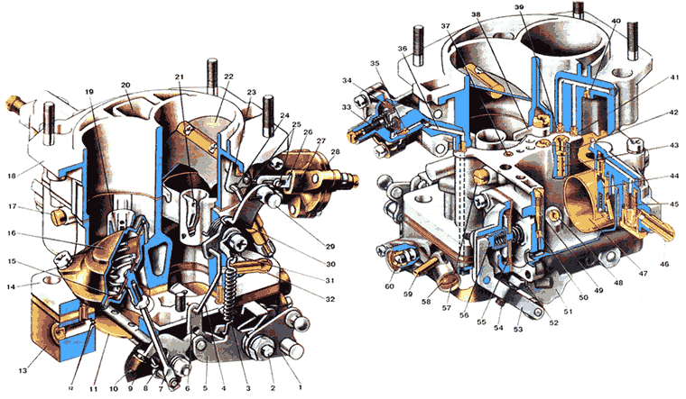 | До 1974 года на автомобили ВАЗ-2101 и ВАЗ-2102устанавливались карбюраторы марок 2101- 1107010 (номер карбюратора отлит на нижнем фланце карбюратора). Основные данные карбюраторов приведены в таблице. С 1974 по 1976. (включительно)на эти автомобили и ВАЗ21011 устанавливались карбюраторы 2101-1107010- 02, с 1977 по 1979 г.г. - карбюраторы 2101-1107010-03. Карбюратор2101-1107010-02 отличается от 2101-1107010 некоторыми дозирующими элементами. Оба карбюратора имеют клапан балансировки поплавковой камеры. Карбюратор 2101- 1107010-03 имеет по сравнению с вышеуказанными улучшенные показатели работы. Уменьшены токсичность отработавших газов двигателя и загрязнение окружающей среды парами бензина; улучшены экономичность, динамка разгона, мощность двигателя и пусковые качества. Для этого изменены диаметры дозирующих элементов, аннулирован клапан разбалансировки поплавковой камеры, в результате чего уменьшено испарение бензина из поплавковой камеры в атмосферу. Отверстие для вывода эмульсии из системы холостого хода расположено в корпусе дроссельных заслонок между первой и второй смесительными камерами, что улучшило распределение топливовоздушной смеси по цилиндрам на холостом ходу двигателя. На винт качества смеси холостого хода напрессована пластмассовая ограничительная втулка. Со второй половины 1979 года на автомобили устанавливают карбюраторы 2105-1107010-10 и 2105-1107010-20, которые являются модификациями карбюратора "Озон" 2105-1107010.Характерными отличиями этих карбюраторов являются наличие дополнительных устройств, оптимизирующих работу двигателя. снижающих выброс двигателем токсических веществ с отработавшими газами до норм, принятых в России, и зарубежных стандартов. У данных карбюраторов уменьшены проходные сечения воздушного тракта и малого диффузора первой камеры; в малых диффузорах установлены штифты. Этим достигается улучшение смесеобразования и распределения смеси по цилиндрам на средних и полных нагрузках. В связи с введением автономной системы холостого хода исключен подогрев каналов системы и изменена конструкция корпуса дроссельных заслонок. Карбюратор 2105-1107010-20 отличается от карбюратора 2105-1107010-10 наличием патрубка, запрессованного в корпус дроссельных заслонок, который соединен шлангом с вакуумным регулятором распределителя зажигания. В альбоме показан карбюратор 2105- 1107010-20. Карбюратор2105-1107010-20 эмульсионного типа, двухкамерный, с падающим потоком. Открытие дроссельной заслонки первой камеры осуществляется от педали управления карбюратором в салоне кузова. Карбюратор имеет сбалансированную поплавковую камеру, две главные дозирующие системы, диафрагменное пусковое устройство, экономайзер(эконостата) с пневматическим приводом, диафрагменный ускорительный насос с механическим приводом, автономную систему холостого хода и переходную систему второй смесительной камеры. Карбюратор оборудован золотниковым устройством вентиляции картера двигателя. Карбюратор2105-1107010-20 состоит из трех корпусных деталей: корпуса 14 карбюратора, крышки 18 карбюратора и корпуса 13 дроссельных заслонок. Крышка18 карбюратора имеет входные горловины первой и второй смесительных камер, канал сообщения полости поплавковой камеры с полостью за фильтрующим элементом воздушного фильтра. В крышке установлены воздушная заслонка 2: пускового устройства, игольчатый клапан 44, поплавок 47,