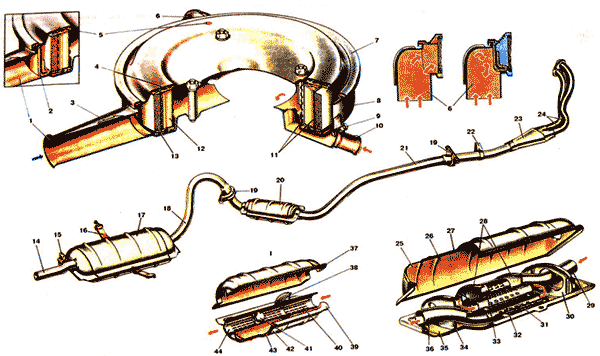 | Воздушный Фильтр обеспечивает очистку воздуха, поступающего в карбюратор, от механических примесей. На двигателе устанавливается одноступенчатый воздушный фильтр сухого типа со сменным фильтрующим элементом, имеющим предочиститель. Воздушный фильтр имеет сезонную регулировку температуры забираемого воздуха. Корпус 8 воздушного фильтра отштампован из стального листа. Корпус фильтра устанавливается на фланце карбюратора на четыре шпильки и крепится самоконтрящимися гайками. На карбюраторе фильтр уплотнен резиновой прокладкой. Сверху корпус фильтра закрывается крышкой 7 с резиновой уплотнительной прокладкой. Крышка крепится тремя гайками, навернутыми на осях с дистанционными выступами. Корпус и крышка покрашены черной эмалью. Фильтрующий элемент изготовлен из специального фильтрующего картона 12, вставленного в металлические перфорированные оболочки И. С наружной стороны надевается фильтрующий элемент 13 из синтетической ваты для предварительной очистки воздуха (предочиститель), увеличивающий пылеемкость фильтра. Фильтрующий элемент устанавливается в корпус 8 и прижимается крышкой 7. Эластичные обеды фильтрующего элемента обеспечивают герметичность соединений элемента с корпусом и крышкой. Корпус фильтра имеет воздухозаборник 1 холодного воздуха и патрубок 6 забора подогретого воздуха из зоны выпускного коллектора отработавших газов. Патрубок 6 соединяется гофрированным шлангом с воздухозаборником теплого воздуха. С нижней стороны к корпусу фильтра приварен коллектор 10 вытяжной вентиляции картера двигателя, который соединяется с пространством за фильтрующим элементом. Патрубок 9 отвода картерных газов соединяется шлангом с золотниковым устройством карбюратора. При работе двигателя воздух поступает в корпус воздушного фильтра через воздухозаборник 1 холодного воздуха из подкапотного пространства или через воздухозаборник теплого воздуха из зоны выпускного коллектора по гофрированному шлангу и патрубку 6. Воздух очищается предочистителем 13 от крупных механических примесей, а бумажным фильтрующим картоном 12 - от мелких примесей и поступает в карбюратор за счет разрежения в цилиндрах двигателя. Для сезонной регулировки температуры всасываемого воздуха крышка 7 воздушного фильтра имеет с одной стороны сезонную перегородку 2, перекрывающую доступ воздуха из воздухозаборника 1 или патрубка 6. При установке воздушного фильтра необходимо правильно располагать его крышку. Летом крышка ставится так, чтобы голубая метка 4 "лето" совпала с черной стрелкой 3 на воздухозаборнике, а зимой - чтобы против стрелки 3 находилась красная метка 5 "зима" на крышке фильтра. В нормальных условиях эксплуатации автомобиля через каждые 20 000 км пробега необходимо заменять фильтрующий элемент. При эксплуатации по очень пыльным дорогам замену необходимо производить через каждые 10 000 км пробега автомобиля. Впускная труба отливается из чугуна, крепится на шпильки головки цилиндров через две уплотнительные металлоасбестовые или ферронитовые прокладки, общие с выпускным коллектором. Впускная труба имеет площадку для установки карбюратора и четыре канала для подачи рабочей смеси в цилиндры двигателя. Труба имеет рубашку подогрева рабочей смеси, которая соединяется каналами с рубашкой охлаждения головки цилиндров. Отвод 