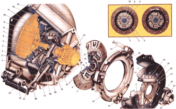 | Сцепление обеспечивает плавное трогание автомобиля с места и бесшумное переключение передач. Принцип его действия основан на передаче крутящего момента от маховика на первичный вал коробки передач за счет сил трений, которые возникают между поверхностями маховика 11, ведомого 4 и нажимного 10 дисков при их сжатии. Ведомый диск расположен на шлицах первичного вала коробки передач, зажимается между маховиком и нажимным диском усилием пружины 1. А нажимной диск 10 вместе с кожухом 12 крепятся болтами к маховику. Таким образом, одни детали имеют постоянную связь с маховиком, другие временную. за счет сил трения, когда сцепление включено. Первые детали составляют ведущую часть сцепления, вторые - ведомую. Отвод нажимного диска от ведомого, т. е. выключение сцепления, осуществляется через гидравлический привод. Ведущая часть сцепления выполнена неразъемным узлом, в который входят кожух 12 сцепления, нажимный диск 10, центральная нажимная пружина 1 и детали, соединяющие их. Этот узел крепится к маховику шестью болтами и тремя установочными штифтами Кожух сцепления имеет вогнутую форму, образующую полость, для размещения нажимной пружины и нажимного диска. Внутри кожуха приварено одно опорное кольцо 17, на которое опирается одна сторона нажимной пружины. К кожуху заклепками 3 крепится нажимная пружина 1. Заклепки проходят через овальные отверстия нажимной пружины. В головки этих заклепок упирается другое опорное кольцо 17. Такое шарнирное соединение позволяет Пружине прогибаться относительно опорных колец. Нажимная пружина отштампована из пружинной стали. Радиальные прорези делят ее поверхность на отдельные лепестки, которые работают как рычаги выключения сцепления. На эти лепестки воздействует упорный фланец 21, который поджат к ним за счет упругости соединительных пластин 18. К наружной поверхности упорного фланца приклеено фрикционное кольцо 19. Наружная кромка нажимной пружины заходит в пазы фиксаторов 16, приклепанных к нажимному диску. Через фиксаторы при прогибе нажимной пружины относительно опорных колец 17 происходит отвод нажимного диска от ведомого. Нажимный диск 10 - чугунный. Имеет форму кольца с тремя приливами. С кожухом сцепления он соединен тремя парами упругих пластин 15, которые приклепаны одним концом к приливам нажимного диска, другим - к кожуху сцепления. Такая связь обеспечивает передачу крутящего момента от кожуха 12 на нажимный диск и одновременно осевое перемещение нажимного диска внутри кожуха сцепления. Ведомая часть сцепления состоит из ведомого диска 4 с фрикционными накладками 2 и гасителя крутильных колебаний (демпфера). Диск стальной, Т-образные радиальные прорези делят его на двенадцать лепестков. На каждом лепестке имеется плоский участок и два гиба (выпуклости), за счет которых поверхность диска имеет волнообразную форму. Чтобы эта форма сохранилась, фрикционные накладки 2 приклепаны к каждому лепестку независимо друг от друга, одна к выпуклой части лепестка, другая - к плоской головки заклепок утопают в отверстиях накладок, а их стержни расклепаны со стороны диска через отверстия в противоположной накладке. Ведомый диск соединен со ступицей 8 не жестко, а эластично через детали демпфера. Такая упругая связь обеспечивает гашение крутильных колебаний, которые возникают в трансмиссии вследствие 