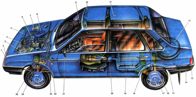 | Автомобили ВАЗ-2108, ВАЗ-2109 и модификации на их базе это прежде всего переднеприводные легковые автомобили. Их компоновочная схема характеризуется передним и поперечным расположением силового агрегата (двигателя в сборе с коробкой передач, главной передачей и дифференциалом). От него крутящий момент передается на передние колеса с помощью валов неравной длины, на концах которых установлены шарниры равных угловых скоростей. Передние ведущие колеса создают высокую устойчивость автомобиля против бокового заноса. Совпадение направления действия силы тяги на передних ведущих колесах с направлением движения колес обеспечивают автомобилю хорошую управляемость, маневренность и проходимость. особенно на скользких и обледенелых дорогах. Переднеприводная компоновка, по сравнению с заднеприводной, позволяет полнее использовать длину автомобиля и уменьшить его массу, сделать удобнее салон и посадку водителя и пассажиров. Увеличивается полезный объем автомобиля без увеличения его габаритов. Это объясняется тем, что отсутствуют промежуточные звенья трансмиссии (карданная передача, задний мост) и поэтому не требуется кожух коробки передач, занимавший значительное пространство в зоне ног на заднеприводных автомобилях, и большой туннель на полу для карданной передачи. На переднеприводных автомобилях в небольшом туннеле пола размещается только система выпуска отработавших газов и привод стояночного тормоза. Весьма компактна и задняя часть автомобиля. Топливный бак 20 размещается под задним сиденьем, а запасное колесо 14 в нише пола багажника. Благодаря этому получен значительный объем багажного отделения. Клиновидная форма кузова позволяет улучшить его аэродинамические характеристики, т.е. уменьшить сопротивление воздуха при движении автомобиля. Этому способствуют сглаженные наружные поверхности кузова, большой наклон передних и задних стекол, а также плавный переход наружной поверхности передних бамперов в формообразующую поверхность кузова. Малое аэродинамическое сопротивление, новый более экономичный двигатель, а также установка новых шин с уменьшенным сопротивлением качению, позволили получить низкий расход топлива. С уменьшением расхода топлива тесно связано снижение массы автомобиля, I .к. каждый килограмм собственного веса автомобиля обходится примерно в 20 г горючего на 100 км пущ Снижению массы способствовала как переднеприводная компоновка автомобиля (отсутствие тяжелого заднего моста, карданной передачи), так и рациональная силовая схема кузова, широкое применение легких пластмасс и новых конструкционных материалов. Из пластмасс изготовлены бампера, различные кожухи, детали отопителя, облицовка салона и багажника. Масса деталей из пластмасс достигает 80 кг. Радиатор и многие детали коробки передач также изготовлены из алюминиевых сплавов, что также позволило уменьшить массу и силового агрегата, и автомобиля в целом. Двигатель. На автомобиле установлен новый двигатель, специально разработанный для поперечного расположения, для чего максимально уменьшена его длина. Подбор оптимального процесса сгорания, фаз газораспределения, формы камеры сгорания и газовых каналов все это позволило довести степень сжатия в двигателе до 9, 9. В сочетании с новым карбюратором и бесконтактной системой зажигания это