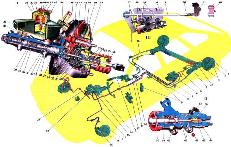 1. Щит тормозного механизма заднего колеса; 2. Колесный цилиндр заднего тормоза; 3. Тормозные колодки заднего тормоза: 4. Шланг заднего тормоза; 5. Упругий рычаг привода регулятора давления; 6. Кронштейн крепления регулятора давления; 7. Рычаг привода регулятора давления; 8. Задний трос стояночного тормоза в сборе; 9. Скоба крепления трубопроводов: 10. Уравнитель троса: 11. Тяга стояночного тормоза; 12. Кронштейн рычага привода стояночного тормоза; 13. Рычаг привода стояночного тормоза; 14. Вакуумный усилитель; 15. Бачок главного цилиндра; 16. Трубопровод контура "левый передний. правый задний тормоза": 17. Диск тормозного механизма переднего колеса; 18. Суппорт в сборе с колесным цилиндром и направляющей колодок; 19. Шланг переднего тормоза; 20. Главный цилиндр гидропривода тормозов; 21. Трубопровод контура "правый передний. левый задний тормоза"; 22. Возвратная пружина диафрагмы; 23. Шток; 24. Чашка корпуса усилителя; 25. Уплотнитель штока; 26. Регулировочный болт; 27. Поршень привода контура "левый передний. правый задний тормоза"; 28. Распорное кольцо; 29. Уплотнительное кольцо высокого давления; 30. Прижимная пружина уплотнительного кольца: 31. Тарелка пружины; 32. Возвратная пружина поршня; 33. Опорная шайба; 34. Соединительная втулка; 35. Корпус бачка главного цилиндра; 36. Крышка бачка: 37. Отражатель: 38. Корпус датчика; 39. Защитный колпачок; 40. Подвижный контакт; 41. Неподвижный контакт; 42. Толкатель: 43. Поплавок; 44. Вакуумный клапан; 45. Корпус усилителя; 46. Уплотнительный чехол; 47. Шпилька; 48. Диафрагма; 49. Крышка корпуса усилителя; 50. Корпус клапана; 51. Буфер штока; 52. Поршень; 53. Клапан; 54. Воздушный фильтр; 55. Толкатель; 56. Защитный чехол корпуса клапана; 57. Пружина рычага; 58. Кронштейн рычага привода регулятора давления; 59. Болты крепления регулятора давления; 60. Скоба серьги; 61. Серьга; 62. Втулка толкателя; 63. Уплотнительное кольцо седла клапана; 64. Клапан регулятора давления; 65. Седло клапана; 66. 66.' Заглушка; 67. Уплотнительное кольцо толкателя; 68. Уплотнитель головки поршня; 69. Поршень регулятора давления; 70. Защитный колпачок; 71. I.Главный цилиндр и вакуумный усилитель; 72. II.Регулятор давления; 73. III.Схема привода тормозов.