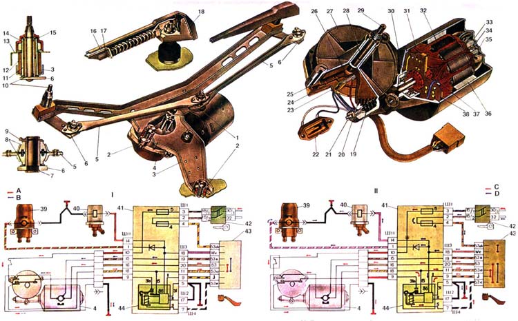 1. Кривошип; 2. Резиновые втулки; 3. Кронштейн привода очистителя; 4. Моторедушор очистителя: 5. Промежуточный рычаг; 6. Поводок: 7. Ось: 8. Вкладыш; 9. Стопорная шайба; 10. Ось рычага; 11. Втулка оси рычага; 12. Подкладка; 13. Панель рамы ветрового окна; 14. Штуцер оси рычага; 15. Колпачок: 16. Рычаг щетки; 17. Шток рычага; 18. Основание рычага; 19. Вал якоря; 20. Шестерня родуктора; 21. Ргулировочный винт; 22. Термобиметаллический предохранитель; 23. Пружинная пластина концевого выключателя; 24. Крышка; 25. Панель; 26. Кулачок; 27. Крышка-картер редуктора; 28. Втулка оси шестерни; 29. Ось шестерни: 30. Шарикоподшипник вала якоря; 31. Обмотка якоря; 32. Сердечник якоря; 33. Втулка заднего конца вала якоря; 34. Подпятник; 35. Корпус: 36. Постоянный магнит; 37. Коллектор; 38. Щеткодержатель; 39. Электродвигатель насоса смывателя; 40. Электромагнитный клапан смыва ветрового стекла; 41. Монтажный блок; 42. Выключатель зажигания; 43. Переключатель очистителей и омывателя стекол; 44. Реле очистителя ветрового стекла; 45. I.Схема включения 1-й и 2-й скорости очистителя; 46. II.Схема включения прерывистого режима работы очистителя и смывателя ветрового стекла; 47. (малая) скорость очистителя; 48. (большая) скорость очистителя; 49. С.Прерывистый режим работы; 50. D.Включение омывателя.