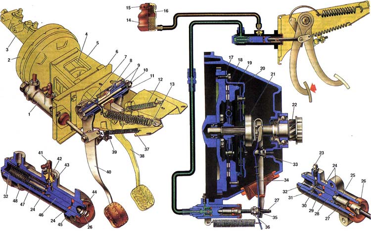 | Для управления сцеплением на автомобиле ВАЗ-21213 применяется гидравлический привод с подвесной педалью и сервопружиной на педали, главным и рабочим гидравлическими цилиндрами, соединенными трубопроводом. Гидравлический привод сцепления обладает высоким коэффициентом полезного действия, простотой технического обслуживания и обеспечивает плавное включение сцепления, что снижает динамические нагрузки в трансмиссии и повышает комфортность езды на автомобиле. В гидравлической системе применяется тормозная жидкость "Роса" в количестве 0,19 л. Полный ход педали сцепления, намеренный по середине площадки педали, составляет 140 мм, а свободный - 25-35 мм. Педаль сцепления 40 установлена в кронштейне 6 педалей сцепления и тормоза на оси 10. На этой же оси крепится и педаль тормоза 38, между педалями установлена дистанционная втулка 8. Внутри ступицы педалей установлены внутренние втулки -11 и пластмассовые наружные втулки 9, которые в процессе эксплуатации не требуют смазки. Педаль сцепления 40 удерживается в исходном положении оттяжной пружиной 37 и прижимается к ограничительному винту 39 с резиновым буфером. С педалью шарнирно связан толкатель, сферический конец которого соприкасается с поршнем 45 главного цилиндра 1. Легкое соприкосновение толкателя с поршнем с зазором 0,1-0,5 мм соответствует ходу педали 0, 4-2 мм и регулируется винтом 39. Данный зазор позволяет при выключенном сцеплении поршню главного цилиндра 1 под действием пружины 47 упереться в стопорное кольцо 44, т.е. занять крайнее положение, при котором происходит сообщение рабочей полости главного цилиндра 1 с бачком 14 через перепускное отверстие. Сервопружина 13 соединяется с педалью 40 крючком 7; назначение сервопружины - уменьшать усилие, прикладываемое на педаль при выключении сцепления. Кронштейн 6 крепится к щитку передка кузова. К кронштейну 6 крепятся со стороны моторного отсека главный цилиндр 1 привода выключения сцепления и кронштейн 5 в сборе с вакуумным усилителем 2 и главным цилиндром 3 привода тормозов. Корпус 48 главного цилиндра привода выключения сцепления изготовлен из чугуна. Передняя сторона корпуса закрыта пробкой 32 с медной прокладкой, задняя сторона защищена от пыли и грязи резиновым колпачком 26. Сверху в одном из приливов корпуса 48 установлен штуцер 41 для соединения главного цилиндра с бачком 14 при помощи гибкого шланга; штуцер 41 уплотняется прокладкой 43 и крепится стопорной шайбой 42. В бачке 14 установлен резиновый отражатель 16 пробки 15. При понижении уровня жидкости давление воздуха над отражателем 16 устраняет возникающее в бачке разрежение, одновременно отражатель 16 защищает жидкость от засорения. В другом приливе корпуса 48 крепится металлическая трубка, являющаяся частью трубопровода, соединяющего главный и рабочий цилиндры привода выключения сцепления. Вторая часть трубопровода, соединяющего главный и рабочий цилиндры, выполнена из резинового гибкого шланга с металлическими наконечниками. Внутри корпуса 48 расположены поршни 45, 46 и пружина 47. Между поршнями находится уплотнитель 24, такая конструкция снижает радиальные нагрузки на поршень 46 при воздействии толкателя и позволяет предотвратить вытекание жидкости из цилиндра за счет сжатия уплотнительного кольца 24 поршнями 45 и 46. За поршнем 46 расположена рабочая полость цилиндра, на выходе соедине