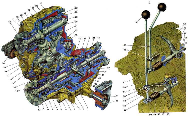 | Для распределения усилия на ведущие мосты автомобиля и трансмиссию введена раздаточная коробка, которая представляет собой двухступенчатый редуктор. Валы, передающие крутящий момент на передний и задний мосты, связаны между собой межосевым дифференциалом, что обеспечивает постоянный привод обоих ведущих маетой и улучшает устойчивость автомобиля. Межосевой дифференциал распределяет усилия на ведущие мосты автомобиля пропорционально сцепной массе, т.е. части полной массы автомобиля, которая приходится на каждую ось ведущих колес. Кроме того, дифференциал позволяет колесам ведущих мостов вращаться с различными скоростями, что устраняет их проскальзывание и повышенный износ шин, а также снижает нагрузки в трансмиссии. Для увеличения проходимости автомобиля дифференциал может быть заблокирован. При блокировке дифференциала загорается контрольная лампа на панели приборов. Ведущий вал 30 установлен на двух шарикоподшипниках 23, расположенных в гнездах передней крышки 18 и картера 27 раздаточной коробки. Внутреннее кольцо переднего подшипника зажато между буртиком ведущего вала, упорным кольцом 22 подшипника, гайкой и фланцем 12, установленными на шлицах вала 30. Передний подшипник и его упорное кольцо закрыты крышкой 21, в которой расположен сальник 13. В осевом направлении вал зафиксирован установочным кольцом, расположенным в канавке заднего подшипника. Это кольцо зажато между картером 27 раздаточной коробки и задней крышкой 31. На ведущем валу подшипник крепится гайкой с упорной шайбой. Гайка после затягивания стопорится за счет вдавливания ее кромок в пазы вала. Шестерня 24 высшей передачи вращается на терма- обработанной шейке ведущего вала. Она имеет два зубчатых венца. Большой венец шестерни находится в постоянном зацеплении с шестерней промежуточного вала 33; с малым венцом шестерни соединяется муфта 26 при включении высшей передачи. Шестерня 28 низшей передачи также имеет два венца: малый венец зацепляется с муфтой 26 при включении низшей передачи, а большой венец находится в постоянном зацеплении с шестерней промежуточного вала. Шестерня 28 вращается на стальной термообработанной втулке 29, которая имеет тугую посадку на ведущем валу. Между шестернями 24 и 28 на шлицах вала насажена ступица 25 муфты включения передач. Промежуточный вал 33 изготовлен в виде блока двух косозубых шестерен, которые находятся в постоянном зацеплении с шестернями высшей и низшей передач ведущего вала. Передний конец вала опирается на роликовый цилиндрический подшипник 19, 'задний на шариковый подшипник 32. От осевого смещения вал удерживается установочным кольцом, расположенным в канавке заднего подшипника. Установочное кольцо зажато между картером раздаточной коробки и задней крышкой 31. На валу подшипник крепится гайкой с упорной шайбой. В передний торец промежуточного вала запрессована ведущая шестерня 16 привода спидометра. Ведомая пластмассовая шестерня 15 привода спидометра неразъемно соединена с валиком, который вращается во втулке и на выходе уплотнен сальником. Вал 11 привода переднего моста имеет зубчатый венец 7, который служит для блокировки дифференциала. Передний конец вала опирается на шариковый подшипник 8, размещенный в картере привода переднего моста. Фиксация подшипника и фланца на валу такая же, как и на ведущем валу. О