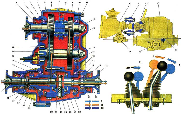 | При движении автомобиля по дорогам с твердым покрытием и при хорошем сцеплении колес с полотном дороги следует двигаться на высшей передаче без блокировки дифференциала. При этом скользящая муфта 8 через ступицу 7 соединяет ведущий вал 12 с шестерней 6 высшей передачи, и крутящий момент будет передаваться с ведущего вала и ступицу на муфту 8 включения передач, затем через шестерню 6 высшей передачи на шестерню постоянного зацепления промежуточного вала и от нее на ведомую шестерню 29 и корпус 23 дифференциала. Корпус дифференциала через ось 26 и сателлиты 25 передает крутящий момент на шестерни 24 привода переднего и заднего мостов. Через эти шестерни крутящий момент передается на валы 22 и 32 привода переднего и заднего мостов. Величина передаваемого крутящего момента находится в прямой зависимости от нагрузки на мостах. Для преодоления крутых подъемов, при движении по слабым грунтам, а также для получения устойчивой минимальной скорости движения на дорогах с твердым покрытием, необходимо включить низшую передачу. Переключать высшую передачу на низшую можно только после полной остановки автомобиля. При этом скользящая муфта 8 блокирует ведущий вал с шестерней 9 низшей передачи, и крутящий момент от ведущего вала через муфту 8 и шестерню 9 передается на промежуточный вал. От вала 14 крутящий момент передается через шестерню постоянного зацепления на ведомую шестерню 29, корпус дифференциала и через ось 26 и сателлиты 25 на шестерни и валы привода переднего и заднего мостов. Для преодоления труднопроходимых участков дорог следует блокировать дифференциал, т.е. соединить скользящей муфтой 31 зубчатый венец (шлицы) вала 32 привода переднего моста и корпус дифференциала. При этом дифференциал выключается, т.е. валы привода переднего и заднего мостов будут вращаться как одно целое, и на оба моста будет передаваться крутящий момент одной величины, что улучшает проходимость автомобиля. Переключать низшую передачу на высшую и блокировать дифференциал можно во время движения автомобиля при любой скорости. Переключение передач и блокировку дифференциала проводите при выключенном сцеплении. В процессе эксплуатации автомобиля из-за износа или повреждения деталей карданной передачи, опор двигателя и раздаточной коробки может возникнуть вибрация раздаточной коробки. Если вибрация раздаточной коробки и пола кузова ощущается в зоне передних сидений при трогании автомобиля с места и разгоне на I, II и III передачах, то следует проверить крепление и состояние болтов эластичной муфты, а также затяжку болтов крепления опор раздаточной коробки и задней опоры коробки передач. Если вибрация раздаточной коробки появляется при движении автомобиля (наиболее характерно при скорости 80-90 км/час), то следует проверить затяжку болтов крепления не только указанных выше соединений, но также проверить состояние карданных шарниров промежуточного, переднего и заднего карданных валов. Шумы при повороте автомобиля или пробуксовке колес возникают при повреждении или предельных износах деталей дифференциала раздаточной коробки. Затрудненное переключение передач или блокировки дифференциала возможно при износе или повреждении муфт переключения и блокировки дифференциала или зубчатых венцов на шестернях и валах. Эта же неисправность возникает при дефор