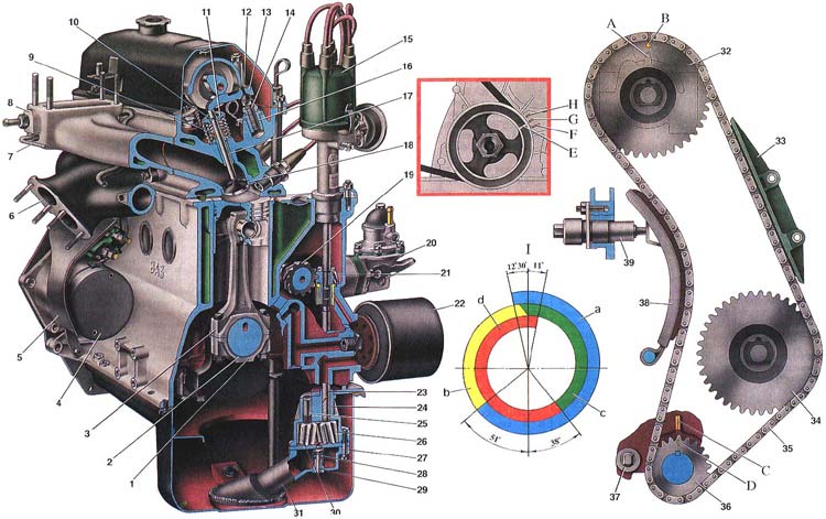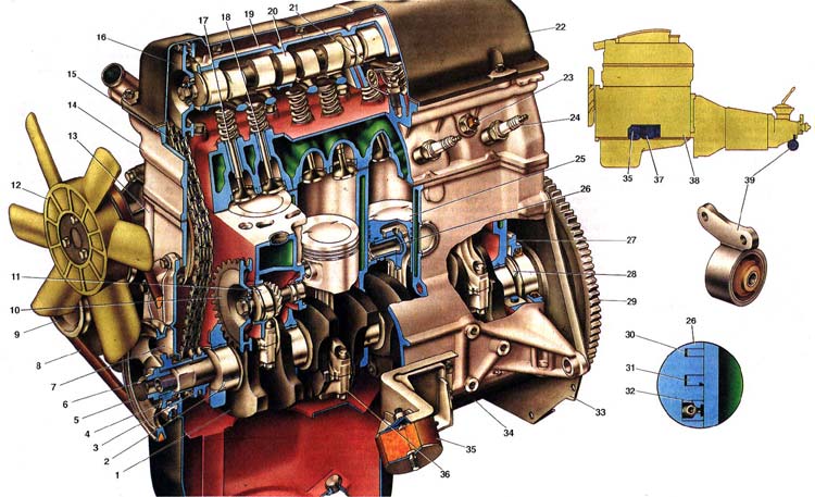 | Компоновка двигателя отличается простотой и компактностью. Все узлы двигателя, требующие регулировки и ухода, расположены в легкодоступных местах. Блок цилиндров. Блок 13 отлит из специального чугуна. Цилиндры блока по диаметру подразделяются через 0,01 мм на пять классов, обозначаемых буквами А, В, С, О, Е. Класс цилиндра указан на нижней плоскости блока против каждого цилиндра. Цилиндр и сопрягающийся с ним поршень должны быть одного класса для обеспечения зазора между поршнем и цилиндром 0,05- 0,07 мм. Диаметры цилиндров каждого класса следующие, мм:Класс Диаметр цилиндра А 82,000-82,010 В 82.010-82,020 С 82,020-82,030 0 82,030-82.040 Е 82,040-82,050 В нижней части блока цилиндров расположены пять опор коренных подшипников коленчатого вала с тонкостенными сталеалюминевыми вкладышами. Отверстия под подшипники коленчатого вала в блоке цилиндров обрабатываются в сборе с крышками. Поэтому крышки подшипников невзаимозаменяемы, и для различия на их наружной поверхности сделаны риски. В задней опоре имеются гнезда для установки упорных полуколец 28, удерживающих коленчатый вал от осевых перемещений. Спереди устанавливается сталеалюминевое полукольцо, а сзади металлокерамическое (желтого цвета), пропитанное маслом. Величина осевого зазора коленчатого вала при сборке двигателя обеспечивается в пределах 0,06-0,2 мм. Если в эксплуатации зазор превышает максимально допустимый (0,35 мм), необходимо заменять упорные полукольца новыми или ремонтными, увеличенными на 0,127 мм. Канавки. находящиеся на одной стороне полуколец, должны быть обращены к упорным поверхностям коленчатого вала. В передней части блока цилиндров имеется полость для привода механизма газораспределения, закрытая крышкой 7. С задней стороны к блоку цилиндров прикреплен держатель 27 заднего сальника. В крышку 7 и держатель 27 установлены самоподжимные сальники. В левой части блока установлен валик 11 привода вспомогательных агрегатов. В отверстия под подшипники валика запрессованы сталеалюминиевые втулки. Головка Цилиндров 14 общая для четырех цилиндров, отлита из алюминиевого сплава. В головку запрессованы чугунные седла и направляющие втулки клапанов. В отверстиях направляющих втулок нарезаны спиральные канавки для смазки. Для уменьшения проникновения масла в камеру сгорания через зазоры между втулкой и стержнем клапана применены металлорезиновые маслоотражательные колпачки. Головка цилиндров крепится к блоку цилиндров .одиннадцатью болтами. Между головкой и блоком цилиндров установлена прокладка, изготовленная из асбестового материала на металлическом каркасе и пропитанная графитом. Поршни 5 изготовлены из алюминиевого сплава. Юбка поршня в поперечном сечении овальная, а по высоте имеет коническую форму. Кроме того, в головки поршня залита стальная термокомпенсационная стальная пластина. Все это выполнено для компенсации неравномерной тепловой деформации поршня при нагреве. В бобышках поршня имеются отверстия для прохода масла к поршневому кольцу. Отверстие под поршневой палец смещено от оси симметрии на 1,2 мм в правую сторону двигателя для уменьшения стука поршня при переходе через ВМТ. Поэтому на днище поршня клеймится стрелка, которая при сборке должна быть обращена в сторону передней части двигателя. Поршни, как и цилиндры, по наружному диаметру сортируются нанять классов через 0,0