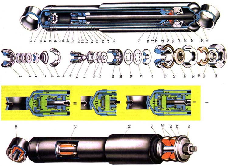 | Для гашения колебаний кузова на подвесках установлены гидравлические телескопические амортизаторы двухстороннего действия, создающие сопротивление колебанию кузова как при ходе сжатия, так и при ходе отдачи. Амортизаторы передней и задней подвесок отличаются размерами, способом крепления верхней части, параметрами рабочей характеристики, а также дроссельными дисками 15 клапана отдачи. Дроссельный диск 15 переднего амортизатора имеет два паза по наружному диаметру, а дроссельный диск заднего амортизатора три. Однако основные детали переднего амортизатора такие же, как и у заднего, поэтому в дальнейшем будет рассматриваться только задний амортизатор. Амортизатор состоит из следующих основных частей: резервуара 19 с проушиной 1, рабочего цилиндра 21, клапана сжатия и штока 20 в сборе с поршнем 10 и клапанами, направляющей втулки 23, гайки 29. уплотнителей и кожуха. Объемом для рабочей жидкости служит цилиндр 21 и резервуар 19, выполненные из трубы. В нижней части резервуара завальцовано дно, на которое опирается клапан сжатия. В верхней части резервуара нарезана резьба под гайку 29. Снаружи к дну резервуара приварена нижняя проушина (головка) амортизатора. Клапан сжатия состоит из корпуса 2, дисков 3 и 4, тарелки 5, пружины 6 и обоймы 7. Корпус клапана сжатия металлокерамический. В его верхней части проточено гнездо с фаской, перекрываемое дисками, которые поджимаются к гнезду пружиной 6 через тарелку 5. Верхний конец пружины упирается в обойму 7, которая надевается на цилиндрический поясок корпуса клапана. Чтобы обеспечить проход жидкости из резервуара 19 в цилиндр 21 и обратно, в нижней части корпуса клапана выполнена цилиндрическая проточка и четыре вертикальных паза приблизительно такой же глубины, как и проточка. Такие же пазы имеются и в верхней части корпуса клапана сжатия. Диски 3 клапана сжатия плоские, выполнены из стальной ленты толщиной 0,15 мм, имеют по центру отверстия для прохода жидкости. В центральном отверстии диска 4 имеется вырез, через который дросселируется жидкость при малой скорости перемещения поршня 10. У тарелки 5 в нижней центральной части имеется цилиндрический выступ, который перекрывает центральное отверстие дисков 3 и 4, но не закрывает дросселирующий вырез. В собранном виде между тарелкой 5 и диском 4 образуется зазор для прохода жидкости. С этой же целью по наружному диаметру тарелки выполнено четыре сквозных отверстия. Обойма 7 имеет отбортовку и цилиндрический поясок, на который плотно насаживается цилиндр 21, что обеспечивает необходимую герметичность между клапаном сжатия и цилиндром. На штампованной поверхности обоймы выполнены шесть боковых и одно центральное отверстия для прохода жидкости. В цилиндре 21 установлен шток с поршнем 10, на котором смонтированы перепускной клапан и клапан отдачи. Поршень имеет вертикальные каналы, расположенные по двум окружностям; между собой каналы каждой окружности соединяются кольцевой проточкой. Каналы, расположенные ближе к центру поршня, перекрываются снизу дисками 15 и 12 клапана отдачи, а сверху - дальше от центра тарелкой 16 перепускного клапана, поджимаемой пружиной 17. Ход тарелки ограничивается упором пружины в тарелку 18. Поршень уплотнен в цилиндре кольцом 13. Диски клапана отдачи поджимаются к нижней торцевой части поршня пружиной 9 через тарелку 1-1. При этом