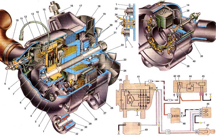 | На автомобилях ВАЗ-21213 применяется трехфазный генератор переменного тока типа 37.3701 со встроенным выпрямительным блоком и микроэлектронным регулятором напряжения. Он служит для питания потребителей автомобиля электрическим током и для зарядки аккумуляторной батареи. Максимальная сила тока отдачи генератора (при 13 В и 5000 об/мин) составляет 55 А, а пределы регулируемого напряжения 14,1+0,5 В. Основные части генератора это ротор, статор 25, крышка 1 с выпрямительным блоком 28, крышка 17 с подшипником 22, шкив с вентилятором 18 и щеткодержатель с регулятором напряжения 14. Крышки и статор стянуты в единое целое четырьмя стяжными болтами, 29. Для предохранения внутренних полостей генератора от грязи крышка 1 закрыта защитным кожухом 2. Воздух для охлаждения генератора берется из верхней зоны моторного отсека и по воздухозаборнику 10 подается к патрубку защитного кожуха. Ротор представляет собой вращающийся электромагнит. Стальные клювообразные полюсные наконечники 19 и 27 и втулка 23, напрессованные на вал ротора, образуют сердечник электромагнита. Между полюсными наконечниками в пластмассовом каркасе находится обмотка 24 ротора, называемая обмоткой возбуждения. Ток в обмотку подводится через медные контактные кольца 4, к которым припаяны выводы обмотки. Вал ротора вращается в двух шариковых подшипниках 5 и 22, установленных в крышках 1 и 17. Подшипники закрытого типа. Смазки, заложенной в них при изготовлении, достаточно на весь срок службы генератора. Внутренняя обойма переднего подшипника 22 свободно посажена на вал ротора и вместе с дистанционным кольцом 21 зажата между ступицей шкива и буртиком вала гайкой крепления шкива. Наружная обойма этого подшипника запрессована в крышку 17 и зажата между двумя шайбами, стянутыми четырьмя винтами. Концы винтов раскернены. Внутренняя обойма заднего подшипника 5 напрессована на вал ротора, а его наружная обойма поджимается резиновым кольцом, помещенным в канавку крышки. Статор генератора состоит из сердечника с обмоткой 26. Сердечник набран из пластин электротехнической стали, соединенных в четырех местах электросваркой. В пазах сердечника уложена трехфазная обмотка статора, концы которой соединены в звезду без вывода нулевой точки. Выпрямитель, преобразующий переменный ток генератора в постоянный, выполнен в виде выпрямительного блока 28. Он представляет собой два алюминиевых держателя с запрессованными в них шестью диодами типа ВА-20 - полупроводниковыми приборами, пропускающими ток только в одном направлении. Для упрощения конструкции выпрямителя применены диоды разной полярности "положительные" и "отрицательные". У положительных диодов на корпусе создается "плюс" выпрямленного напряжения, а у отрицательных "минус". Положительные диоды запрессованы в держатель 37 выпрямительного блока, а отрицательные - в держатель 34. Выпрямительный блок крепится к крышке 1 тремя болтами 3, изолированными вместе с держателем положительных диодов от крышки пластмассовыми втулками. Гайками этих болтов одновременно зажимаются выводы диодов и обмотки статора. К держателю 37 присоединен зажим "30" генератора (болт 9), являющийся выводом "плюс" выпрямителя. Выводом "минус" является масса генератора. На держателе 37 выпрямительного блока установлены также и три дополнительных диода 40. Напряжение, снимаемое с этих диод