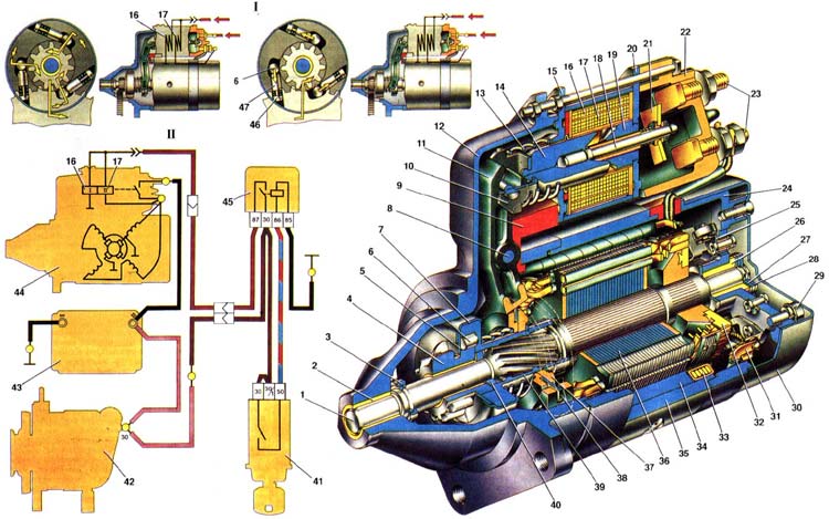 | На автомобилях ВАЗ-2113 для пуска двигателя применяется стартер 35.3708 мощностью 1,3 кВт, с электромагнитным включением шестерни привода, с роликовой обгонной муфтой и дистанционным управлением. Он представляет собой четырехшеточный, четырехполюсный электродвигатель постоянного тока со смешанным возбуждением и состоит из корпуса 35 с обмотками возбуждения, якоря с приводом, двух крышек 2 и 4 и тягового электромагнитного реле. Крышки и корпус стянуты в единое целое двумя болтами, ввернутыми в крышку 2. Внутри стального корпуса закреплены винтами четыре стальных полюса 34. На полюсы надеты катушки обмотки. Корпус вместе с полюсами и катушками образует статор стартера. Три катушки обмотки статора являются сериесными, т.е. соединены с обмоткой якоря последовательно, а одна шунтовая, присоединенными параллельно обмотке якоря. Поэтому возбуждение стартера и называется смешанным. Оно обеспечивает сравнительно низкую частоту вращения якоря на холостом ходу без нагрузки, что уменьшает износ втулок подшипников вала якоря, облегчает условия работы обгонной муфты и предотвращает разнос якоря. Якорь стартера состоит из вала 1, сердечника с обмоткой из медной ленты и коллектора 32. Вал якоря вращается в двух металлокерамических втулках 2 и 26, запрессованных в крышки стартера и пропитанных маслом. Осевой свободный ход вала якоря регулируется подбором шайб 27 и должен быть не более 0,5 мм. Особенностью стартера является торцевой коллектор 32. Он выполнен в виде пластмассового диска с залитыми в нем медными пластинами. Такой коллектор способствует более стабильной и длительной работе щеточного контакта, уменьшается расход меди, снижается длина и масса стартера. На переднем конце вала якоря установлен привод стартера, состоящий из роликовой обгонной муфты и шестерни 4. Назначение обгонной муфты - передавать крутящий момент от вала якоря стартера к венцу маховика при пуске двигателя, а после пуска, работая в режиме обгона, не допускать передачи крутящего момента от маховика на якорь. Иначе может произойти выброс обмотки якоря из пазов сердечника из-за "разноса" чрезмерно высокой частоты вращения якоря маховиком работающего двигателя. Обгонная муфта состоит из наружного кольца с роликами 6 и внутреннего кольца, объединенного с шестерней 4 привода. Наружное кольцо имеет три паза с отверстиями, в которых находятся стальные ролики с пружинами, плунжерами и направляющими стержнями. Пазы для роликов с переменной шириной. В широкой части паза ролики могут свободно вращаться, а в узкой заклиниваются между наружным и внутренним кольцами. Электромагнитное тяговое реле стартера служит для ввода шестерни привода в зацепление с венцом маховика и для замыкания цепи питания обмоток якоря и статора. Магнитную систему реле образуют фланцы 15 и 20, ярмо (окружающее обмотку) и сердечник 19, запрессованный во фланец 20. На каркасе из латунной трубки и пластмассовых щек намотана катушка реле с двумя обмотками: удерживающей 16 и втягивающей 17. Обе обмотки намотаны в одну сторону. Начала обмоток припаяны к штекеру "50". Конец удерживающей обмотки приварен к фланцу 20 реле (т.е. соединен с "массой"), а конец втягивающей обмотки соединен с нижним контактным болтом 23 реле. Работа стартера. Стартер включается с помощью вспомогательного реле 45 типа 113.3747- 10. При повороте ключа в 