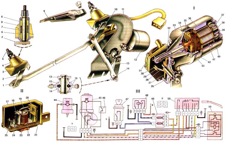 | На автомобилях ВАЗ-21213 применяется электрический очиститель ветрового стекла с параллельным движением щеток. Он состоит из рычажного механизма, щеток с рычагами и моторедуктора 12. Вращение кривошипа 13 тягой 14 преобразуется в качание поводков 2 и 10, связанных тягой 1. Частота качания рычагов составляет 50-70 двойных ходов в минуту. Оси поводков вращаются каждая в двух металлокерамических втулках 6, разделенных войлочной вставкой 7. Втулки и войлок пропитаны маслом. Тяги 1 и 14 соединяются с поводками и кривошипом сферическими шарнирами, в которых находятся по два полусферических металлокерамических вкладыша 16, пропитанных маслом, которым также заполнено и пространство между вкладышами. Моторедуктор состоит из электродвигателя с возбуждением от постоянных магнитов и червячного редуктора. Электродвигатель имеет стальной корпус 40, внутри которого пружинными держателями закреплены два постоянных магнита 36, образующие вместе с корпусом статор. Вал якоря вращается в двух металлокерамических втулках, закрепленных стальными обоймами одна в корпусе, а другая в крышке 33. Вокруг втулок помещены войлочные кольца 37, пропитанные маслом. Осевое усилие, действующее на вал якоря от червячной передачи, воспринимается текстолитовым подпятником 38, в который упирается задний конец вала. Осевой свободный ход вала регулируется подбором шайб, устанавливаемых между коллектором и передней втулкой вала якоря. Корпус электродвигателя закрывается крышкой 33, являющейся одновременно картером редуктора. Крышка отлита из алюминиевого сплава и крепится к корпусу двумя винтами. С внутренней стороны к крышке приклепан пластмассовый щеткодержатель 35 с двумя щетками, а с наружной (в картере редуктора) находится пластмассовая червячная шестерня 27 с кулачком. Шестерня напрессована на ось 26, которая вращается в металлокерамической втулке, запрессованной в крышку 33. Передаточное отношение редуктора составляет 51:1. Картер редуктора закрывается пластмассовой панелью и крышкой 31. В панели находятся контактные стойки, к которым припаиваются провода и крепится пружинная пластина 28 с контактами выключателя, обеспечивающего остановку электродвигателя в тот момент, когда щетки находятся в нижнем положении. Контакты пружинной пластины прижимаются к стойке 30, соединенной с источником питания. Когда выступ кулачка шестерни находится против пластины, он отжимает ее от стойки 30 и прижимает к стойке 29, соединенной с "массой". В очистителе устанавливается термобиметаллический предохранитель 46 многоразового действия, который защищает цепь питания обмотки якоря электродвигателя от перегрузок при заедании механизма очистителя или примерзании щеток к стеклу. Реле очистителя ветрового стекла. Для получения прерывистой работы очистителя применяется реле типа РС-514. Оно устанавливается под панелью приборов с левой стороны. На сердечнике в пластмассовом каркасе находится обмотка 22 сопротивлением 66 Ом. На пластмассовой опоре 20 расположены две пары неподвижных контактов. Верхняя пара контактов является нормально замкнутой. При срабатывании реле верхняя пара контактов размыкается, а нижняя замыкается. Прерыватель состоит из биметаллической пластинки 25 с обмоткой из нихромовой проволоки. Работа очистителя Рычаг переключателя очистителя расположен с правой сто