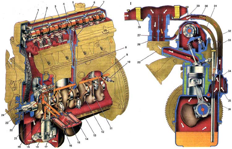| Система смазки комбинированная: под давлением и разбрызгиванием. Под давлением смазываются коренные и шатунные подшипники, опоры распределительного вала, подшипники вала привода масляного насоса и распределителя зажигания, кулачки распределительного вала и втулка шестерни привода масляного насоса и распределителя зажигания. Маслом, вытекающим из зазоров и разбрызгиваемым движущимися деталями, смазываются стенки цилиндров, поршни с поршневыми кольцами, поршневые пальцы в бобышках поршня, цепь привода механизма газораспределения, опоры рычагов привода клапанов, а также стержни клапанов в их направляющих втулках. Вместимость системы смазки 3,75 л. В систему смазки входят: масляный насос 18, приемный патрубок с фильтрующей сеткой, прикрепленный к корпусу насоса, полнопоточный масляный фильтр, установленный на левой передней стороне двигателя, редукционный клапан давления масла, встроенный в приемный патрубок, электрический датчик 10 недостаточного давления масла. Датчик недостаточного давления масла соединен с сигнальной лампой на щитке приборов, которая загорается при падении давления масла до 0,02-0,06 МПа (0,2-0,6 кгс/см2). При работе двигателя с исправной системой смазки лампа должна гаснуть (если двигатель не перегрет). Циркуляция масла при работе двигателя происходит следующим образом. Масляный насос 18, приводимый в действие парой шестерен со спиральными зубьями, засасывает масло из картера 13 через фильтрующую сетку маслоприемного патрубка и подает его по каналу 19 в полнопоточный фильтр. Отфильтрованное масло по каналу 20 попадает в магистральный масляный канал 9, проходящий вдоль блока с левой стороны, а оттуда по каналам 23 и 11, просверленным в блоке цилиндров, проникает к коренным подшипникам коленчатого вала и переднему подшипнику валика 24 привода масляного насоса и распределителя зажигания. К центральной опоре распределительного вала масло подводится по каналам 7, просверленным в блоке цилиндров, в головке и в корпусе подшипников распределительного вала. Масло, подошедшее к центральной опоре распределительного вала через канавку в опорной шейке, попадает в центральный канал распределительного вала, а из канала через отверстия в кулачках и в опорных шейках - к кулачкам, рычагам и опорам вала. Масло от первого подшипника валика 24 привода масляного насоса и распределителя зажигания поступает ко второму подшипнику по каналу, просверленному в самом валике. К втулке шестерни привода масляного насоса и распределителя зажигания масло подводится по отдельному каналу 21 из полости блока перед масляным фильтром. Остальные детали смазываются разбрызгиванием и самотеком. Цепь механизма газораспределения смазывается маслом, которое выходит из передней опоры распределительного вала и передней втулки вала привода масляного насоса и распределителя зажигания, и затем разбрызгивается через радиальные каналы 1 на звездочках указанных валов. Для того чтобы при работе двигателя на любом режиме обеспечить необходимое давление масла в магистрали, а также чтобы компенсировать увеличивающийся при износе двигателя расход масла, масляный насос имеет избыточную производительность. Для предотвращения повышения давления масла сверх допустимого в системе установлен редукционный клапан, перепускающий избыточное масло в масл