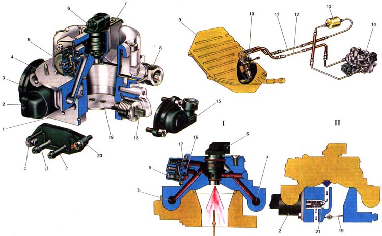 | На автомобилях ВАЗ-21214 устанавливается двигатель с системой центрального впрыска топлива, т.е. топливо впрыскивается одной форсункой в агрегат центрального впрыска. Здесь топливо перемешивается с воздухом и в виде горючей смеси по впускной трубе подается в цилиндры двигателя. Система впрыска топлива в сочетании с каталитическим нейтрализатором в системе выпуска позволяет снизить токсичность отработавших газов при улучшении ездовых качеств автомобиля. В качестве топлива необходимо применять только неэтилированный бензин. Применение этилированного бензина приведет к повреждению нейтрализатора, датчика кислорода и к отказу системы. Нейтрализатор устанавливается в системе выпуска отработавших газов перед дополнительным глушителем. Он содержит два окислительных катализатора (ускорителя химической реакции) и один восстановительный. Окислительные катализаторы (платина и палладий) способствуют преобразованию углеводородов в водяной пар, а окиси углерода в двуокись углерода. Восстановительный катализатор (родий) способствует преобразованию окислов азота в безвредный азот. В связи с тем, что каталитическому нейтрализатору требуется кислород для нейтрализации углеводородов и окиси углерода, и одновременно он должен отнимать кислород для нейтрализации окислов азота, необходимо очень строго поддерживать баланс смеси воздух/топливо (примерно 14, 7: 1), поступающей в двигатель. Эту функцию выполняет электронный блок управления. Электронный блок управления (ЭБУ), расположенный под панелью приборов на левой боковине кузова, является управляющим центром системы впрыска топлива. Это специализированный компьютер. Он непрерывно обрабатывает информацию от различных датчиков и управляет системами, влияющими на токсичность отработавших газов и на эксплуатационные показатели автомобиля. ЭБУ выполняет также диагностическую функцию системы впрыска топлива. Он может распознавать неполадки в работе системы, предупреждая о них водителя через контрольную лампу "CHECK ENGINE". Кроме того, он хранит диагностические коды, указывающие области неисправности, чтобы помочь специалистам в проведении ремонта. Агрегат центрального впрыска топлива 14 устанавливается на впускной трубе вместо карбюратора. В нем находится форсунка 6 для впрыска топлива, регулятор 5 давления топлива, регулятор 2 холостого хода, дроссельная заслонка 19 и датчик 15 положения дроссельной заслонки. Для отбора разрежения имеются три патрубка с, d и е, соединенные с задроссельным пространством. Форсунка 6 представляет собой электромагнитный клапан. Когда на нее от ЭБУ поступает импульс напряжения, то клапан открывается и топливо через распылитель тонко распыленной струей под давлением впрыскивается в смесительную камеру над дроссельной заслонкой. После прекращения подачи электрического импульса подпружиненный клапан перекрывает подачу топлива. Регулятор 5 давления топлива состоит из клапана 16 с диафрагмой 17, поджатого пружиной к седлу в корпусе 4. Когда давление топлива превышает 190...210 кПа, клапан открывается и избыток топлива по сливной магистрали 12 сливается в топливный бак. Регулятор 2 холостого хода регулирует частоту вращения коленчатого вала на режиме холостого хода, управляя количеством подаваемого воздуха в обход закрытой дроссельной заслонки 19. Он со