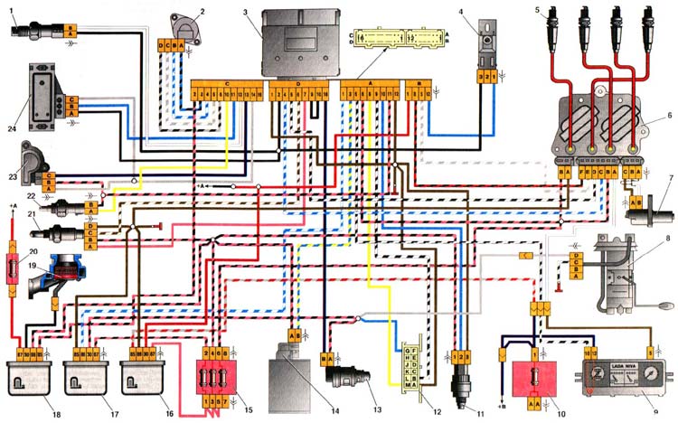 | 1. Корпус дроссельной заслонки; 2. Регулятор холостого хода; 3. Сектор привода дроссельной заслонки; 4. Корпус тепли воподачи; 5. Регулятор давления топлива; 6. Форсунка; 7. Держатель форсунки; 8. Штуцер подвода топлива; 9. Топливный бак; 10. Электробензонасос с датчиком уровня топлива; 11. Магистраль подачи топлива; 12. Магистраль слива топлива: 13. Топливный фильтр; 14. Агрегат центрального впрыска топлива; 15. Датчик положения дроссельной заслонки. 16. Клапан роулятора давления топлива; 17. Диафрагма: 18. Ось дроссельной заслонки: 19. Дроссельная заслонка; 20. Модуль вакуумных трубок; 21. Клапан регулятора холостого хода; 22. а.Канал подвода топлива; 23. в.Канал слива топлива; 24. с.Патрубок для шланга продувки адсорбера; 25. d.Патрубок для шаланга системы вентиляции картера, 26. е.Патрубок для шаланга к датчику абсолютною давления, 27. I.Схема работы регулятора давления топлива; 28. II.Схема работы регулятора холостого хода: 29. А-подача воздуха в обход дроссельной заслонки. 1. Датчик температуры воздуха; 2. Регулятор холостого хода; 3. Электронный блок управления; 4. Октан-потенциометр; 5. Свечи зажигания; 6. Модуль зажигания; 7. Датчик положения коленчатого вала; 8. Электробензонасос с датчиком уровня топлива; 9. Комбинация приборов с тахометром к контрольной лампой "CHECK ENGINE"; 10. Основной блок пцедохранителей автомобиля: 11. Датчик скорости; 12. Колодка диагностики: 13. Форсунка; 14. Клапан продувки адсорбера; 15. Блок предохранителей системы впрыска; 16. Реле зажигания; 17. Реле включения бензонасоса; 18. Реле электроподогрееателя впускной трубы; 19. Электроподогреватель впyскной трубы; 20. Предохранитель подогревателя впускной трубы; 21. Датчик концентрации кислорода; 22. Датчик температуры охлаждающей жидкости; 23. Датчик положения дроссельной заслонки; 24. Датчик абсолютного давления; 25. А.К клемме "плюс" аккумуляторной батареи; 26. В.К клемме "15" выключателя зажигания. |