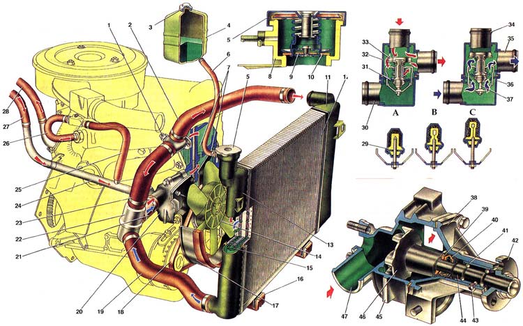 | Система охлаждения двигателя - жидкостная, закрытая, с принудительной циркуляцией охлаждающей жидкости. Система заполняется охлаждающей жидкостью Тосол Д-40 водным раствором антифриза Тосол-А (концентрированный этиленгликоль с антикоррозионными и антивспенивающими присадками плотностью 1,078-1,085 г/см2). В систему охлаждения заправляется 10,7 л, включая систему отопления салона кузова. Уровень жидкости в расширительном бачке должен быть на 3-4 см выше метки "MIN", проверяется на холодном двигателе (при 15-20 С). Для контроля температуры охлаждающей жидкости имеется датчик, установленный в головке цилиндров, и указатель на щитке приборов. Система охлаждения включает: насос 20 охлаждающей жидкости, рубашки охлаждения блока и головки цилиндров, термостат 22, вентилятор, радиатор, расширительный бачок 4, трубопроводы и шланги. При работе двигателя жидкость, нагретая в рубашках охлаждения, поступает через выпускной патрубок по шлангам 2 и 23 в радиатор или термостат в зависимости от положения клапанов термостата. Далее охлажденная жидкость всасывается насосом 20 и подается вновь в рубашки охлаждения. Насос охлаждающей жидкости - центробежного типа, приводится в действие от шкива коленчатого вала клиновидным ремнем привода генератора. Корпус 45 и крышка 38 насоса отлиты из алюминиевого сплава. В крышке в подшипнике 41, который стопорится винтом 43, установлен валик 44. Подшипник 41 двухрядный, неразборный, без внутренней обоймы. Подшипник заполнен смазкой Литол-24 при сборке и в дальнейшем не смазывается. На валик с одной стороны напрессована чугунная крыльчатка 46, а с другой - ступица 42 шкива привода насоса. Торец крыльчатки, соприкасающийся с уплотнительным кольцом, закален токами высокой частоты на глубину 3 мм. Уплотнительное кольцо прижимается к крыльчатке пружиной сальника через резиновую манжету. Сальник 40 неразборный, состоит из наружной латунной обоймы, резиновой манжеты и пружины. Сальник запрессован в крышке 38 насоса. Насос приводится в действие клиновидные ремнем 18. Вентилятор представляет собой шестилопастную крыльчатку 14, изготовленную из пластмассы, которая крепится болтами к ступице 42 шкива привода насоса. Лопасти вентилятора имеют переменный по радиусу угол установки и для уменьшения шума переменные шаг по ступице. Для лучшей эффективности работы вентилятор находится в кожухе 17, который крепится болтами к кронштейнам радиатора. Радиатор и расширительный бачок. Радиатор разборный, с пластмассовыми бачками 11 и 13, с двумя рядами алюминиевых горизонтальных трубок и алюминиевыми охлаждающими пластинами. Сердцевина 12 радиатора уплотняется с бачками резиновыми прокладками. Для лучшей эффективности охлаждения жидкости в трубки устанавливаются турбулизаторы 15. Радиатор устанавливается на резиновые опоры 16 и крепится болтами к передку кузова. Заливная горловина радиатора закрывается пробкой 5 и соединяется шлангом с полупрозрачным пластмассовым расширительным бачком 4. Пробка радиатора имеет впускной 9 и выпускной 10 (паровой) клапаны, через которые радиатор соединяется с расширительным бачком. Впускной клапан 9 не прижат к прокладке (зазор 0,5-1,1 мм) и допускает впуск и выпуск охлаждающей жидкости в расширительный бачок при нагревании и охлаждении двигателя. При закипании жидкости или резком увеличении температуры из-за неб