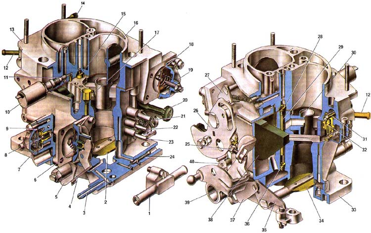 | На автомобилях ВАЗ-21213 устанавливается карбюратор модели 2-1073-1107010. Тарировочные данные карбюратора приведены в таблице. Карбюратор имеет сбалансированную поплавковую камеру, систему отсоса картерных газов за дроссельную заслонку, блокировку второй камеры. В карбюраторе имеются две главные дозирующие системы первой и второй камер, система холостого хода первой камеры с переходной системой, переходная система второй камеры, экономайзер принудительного холостого хода, экономайзер мощностных режимов, диафрагменный ускорительный насос с механическим приводом и диафрагменное пусковое устройство. Карбюратор состоит из двух корпусных деталей: корпуса 33 и крышки 13 карбюратора. Во входной горловине первой камеры установлена воздушная заслонка 16 пускового устройства. На оси воздушной заслонки жестко установлен рычаг 27 с двумя штифтами, на один из которых надета возвратная пружина. Второй штифт входит в фигурный паз рычага 26 управления воздушной заслонкой. На наружную кромку рычага 26 опираются регулировочный винт 25 приоткрывания дроссельной заслонки первой камеры и штифт рычага 40 блокировки второй камеры. В крышке 13 карбюратора установлены игольчатый запорный клапан 32 подачи топлива, поплавок 38, топливный фильтр 31, патрубок 14 подачи топлива в поплавковую камеру. К приливу крышки 13 крепится крышка пускового устройства с диафрагмой 18 в сборе со штоком. В крышку завернут электромагнитный запорный клапан 10 с топливным жиклером холостого хода. В корпусе 33 карбюратора отлиты большие диффузоры и установлены малые легкосъемные диффузоры, отлитые заодно с распылителями главных дозирующих систем. В корпусе 33 установлены распылители 17 ускорительного насоса с шариковым клапаном, главные воздушные жиклеры 15 и 28 с эмульсионными трубками 29 в эмульсионных колодцах, заборная трубка переходной системы с топливным жиклером. В эмульсионные колодцы завернуты главные топливные жиклеры 36. В приливы корпуса карбюратора устанавливаются регулировочный винт полноты закрытия дроссельной заслонки 34 второй камеры, а также регулировочный винт 20 количества смеси холостого хода с Электра приводом конечного выключателя экономайзера принудительного холостого хода. В корпус завернут регулировочный винт 24 качества смеси холостого хода. К приливу корпуса 33. образующему рабочую полость ускорительного насоса, четырьмя винтами крепится крышка ускорительного насоса с рычагом 4 привода в сборе с диафрагмой 6 насоса. К корпусу крепится также винтами крышка экономайзера мощностных режимов с рабочей диафрагмой 9. На диафрагму воздействует пружина. В корпус карбюратора под диафрагмой 9 установлены топливный жиклер 7 и клапан экономайзера мощностных режимов. В нижней части корпуса 33 установлены на осях дроссельные заслонки 2 и 34. На оси дроссельной заслонки первой камеры установлены: рычаг 39 привода дроссельных заслонок с регулировочным винтом 25 приоткрывания заслонки и с рычагом 40 блокировки второй камеры; рычаг 37 привода дроссельной заслонки второй камеры; возвратная пружина и кулачок 5 ускорительного насоса. На оси дроссельной заслонки второй камеры установлен рычаг 35 дроссельной заслонки. Блокировка второй камеры не допускает открывания дроссельной заслонки второй камеры на любом режиме работы двигателя, если полностью не открыта воздушна