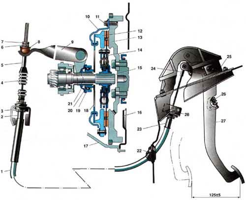 Диск ВАЗ-2112 той же размерности (200x140), что и ВАЗ-2110, но передает более высокий крутящий момент за счет усиленной нажимной пружины (в среднем на 12%). Диски 2112 можно ставить на "десятку". При этом несколько возрастает усилие на педали сцепления. "Десятые" диски на "двенадцатый" двигатель ставить нельзя. Привод сцепления - тросовый, беззазорный (свободный ход педали отсутствует, сцепление постоянно включено). Педаль сцепления 27 установлена на оси в специальном кронштейне 25. Ее верхний конец соединен с наконечником троса 24, оболочка которого со стороны салона закреплена на кронштейне педали сцепления, а в моторном отсеке - на кронштейне 3 силового агрегата. Соответствующий поводок троса 8 соединен с вилкой выключения сцепления 9. Конец троса защищен резиновым чехлом 4, рядом расположены две гайки 6 и 7 для регулировки привода. После регулировки гайки контрят, стянув их вместе.