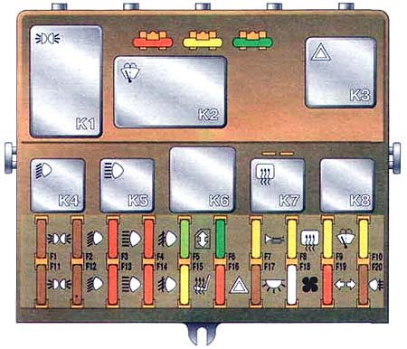 Большинство предохранителей и реле находятся в монтажном блоке, расположенном в салоне автомобиля левее и выше педального узла. Номинальный ток предохранителей и защищаемые ими цепи указаны в таблице. При выходе из строя монтажного блока возможна замена печатной платы или припайка проводов взамен перегоревших токоведущих дорожек.
