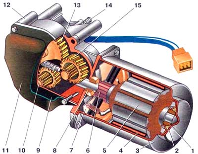 Очиститель ветрового стекла состоит из моторедуктора, рычагов и щеток. Электродвигатель очистителя - трехщеточный, с возбуждением от постоянных магнитов, двухскоростной. Для защиты от перегрузок в нем установлен термобиметаллический предохранитель, а для снижения радиопомех - конденсаторы и дроссели. Очиститель имеет три режима работы, они включаются правым подрулевым переключателем. Прерывистый режим обеспечивается электронным реле К2 типа 524.3747, установленным в монтажном блоке. Это реле также включает малую скорость моторедуктора очистителя при включении омывателя ветрового стекла. Реле должно обеспечивать включение электродвигателя с частотой 14±4 цикла в минуту при частоте вращения вала моторедуктора не менее 20 мин-1, температуре 20±5°С и напряжении питания 14±0,2 В. При работе очистителя на малой скорости в постоянном режиме напряжение питания подводится к диаметрально противоположным щеткам. При работе очистителя на максимальной скорости "+" питания подводится к щетке, расположенной сбоку. Для разгрузки контактов выключателя зажигания очиститель подключен через дополнительное реле Кб в монтажном блоке. |