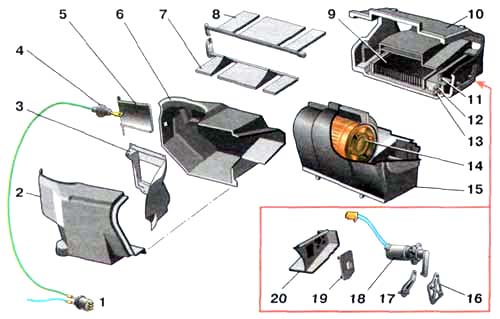 | 1. воздуховоды обогрева задней части салона; 2. облицовка тоннеля пола; 3. воздуховоды обогрева ног; 4. центральные сопла вентиляции салона; 5. боковые сопла вентиляции салона; 6. сопла обогрева стекол передних дверей; 7. рычаг управления системой отопления салона; 8. корпус воздухораспределителя; 9. заслонка обогрева ног; 10. заслонка обогрева ветрового стекла; 11. отопитель. 1. электропневматический клапан; 2. передний корпус воздухозаборника отопителя; 3. водоотражательный щиток воздухозаборника; 4. клапан управления заслонкой рециркуляции; 5. заслонка рециркуляции воздухозаборника; 6. задний корпус воздухозаборника отопителя; 7. заслонка канала отопителя; 8. заслонка управления отопителем; 9. радиатор; 10. кожух радиатора отопителя; 11. штуцер пароотводящего шланга; 12. штуцер подводящего шланга; 13. штуцер отводящего шланга; 14. электродвигатель отопителя с вентилятором; 15. корпус электродвигателя; 16. опорная площадка рычага привода заслонки управления отопителем; 17. рычаг привода заслонки управления отопителем; 18. микромоторедуктор привода заслонки; 19. резистор; 20. крышка кожуха отопителя. |