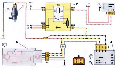 Очиститель включается правым подрулевым переключателем. При включении прерывистого режима первые 3-4 двойных хода выполняются в непрерывном режиме. Питание к подрулевому переключателю подается от дополнительного реле Кб в монтажном блоке.
