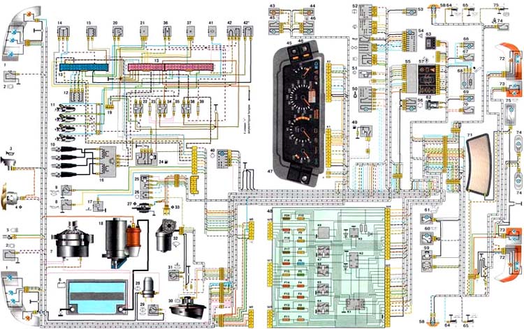 | 1. блок-фара; 2. датчики износа колодок передних тормозов; 3. звуковой сигнал; 4. вентилятор системы охлаждения; 5. выключатель света заднего хода; 6. аккумуляторная батарея; 9. генератор: 8. датчик контрольной лампы давления масла; 9. датчик уровня масла; 10. свечи зажигания; 11. форсунки; 12. регулятор холостого хода; 13. колодки электронного блока управления; 14. датчик положения дроссельной заслонки; 15. датчик положения коленчатого вала; 16. модуль зажигания; 17. датчик указателя температуры охлаждающей жидкости; 18. стартер; 19. колодка диагностики; 20. датчик температуры охлаждающей жидкости; 21. датчик скорости; 22. реле включения бензонасоса; 23, 35, 39. плавкие предохранители; 24. электробензонасос; 25. микромоторедуктор привода заслонки отопителя; 26. клапан рециркуляции; 27. вентилятор отопителя; 28. насос омывателя ветрового стекла; 29. датчик уровня омывающей жидкости; 30. датчик уровня тормозной жидкости; 31. датчик уровня охлаждающей жидкости; 32. моторедуктор стеклоочистителя; 33. дополнительный резистор вентилятора отопителя; 34. реле включения питания системы впрыска; 36. клапан продувки адсорбера; 37. датчик расхода воздуха; 38. реле включения вентилятора системы охлаждения; 40. переключатель наружного освещения; 41. датчик детонации; 42. датчик концентрации кислорода (подогреваемый лямбда-зонд); 42*. СО-потенциометр (ставится на машинах, эксплуатируемых на этилированном бензине, в этом случае датчик концентрации кислорода не устанавливается); 43. контрольная лампа противотуманного света; 44. контрольная лампа обогрева заднего стекла; 45. выключатель противотуманного света; 46. выключатель обогрева заднего стекла; 47. комбинация приборов; 48. монтажный блок; 49. датчик уровня топлива; 50. выключатель зажигания; 51. регулятор яркости подсветки приборов; 52. подрулевой переключатель; 53. лампа подсветки рычагов управления отопителем; 54. выключатель аварийной сигнализации; 55. электронный блок управления отопителем; 56. выключатель клапана рециркуляции топлива; 57. блок индикации бортовой системы контроля; 58. боковые указатели поворота; 59. датчик температуры для системы отопления; 60. плафон освещения салона; 61. плафон местного освещения салона; 62. розетка для переносной лампы; 63. электронные часы; 64. дверные выключатели передних дверей; 65. дверные выключатели задних дверей; 66. лампа освещения вещевого ящика; 67. выключатель освещения вещевого ящика; 68. прикуриватель; 69. лампа освещения пепельницы; 70. выключатель стоп-сигнала; 71. элемент обогрева заднего стекла; 72. наружные задние фонари; 73. внутренние задние фонари; 74. лампы освещения номерного знака; 75. лампа освещения багажника. |