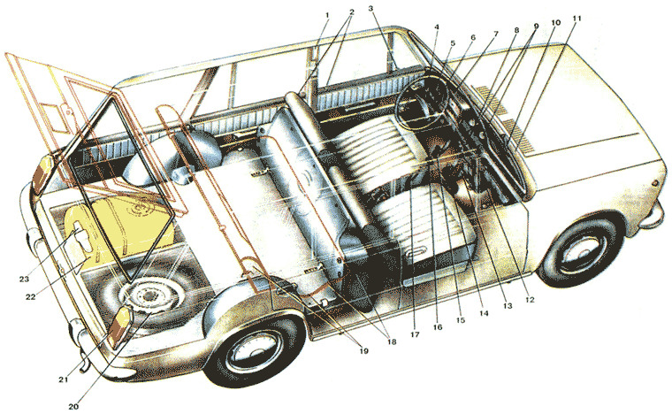 | В альбоме описана и наглядно показана конструкция легкового автомобиля ВАЗ-2102 и его модификаций, выпускавшихся Акционерным обществом "АВТОБАЗ" с 1970 по 1988 г. Модификации отличаются от базовых моделей, в основном, установкой двигателей с другим рабочим объемом цилиндров. Компоновка (расположение узлов и агрегатов) автомобилей выполнена по так называемой классической схеме, т.е. двигатель расположен спереди, а ведущими являются задние колеса. Двигатель максимально продвинут вперед, что обеспечивает оптимальное распределение массы по осям, а следовательно, хорошую устойчивость автомобиля на дороге. Салон расположен внутри базы, т.е. в зоне наилучшей плавности хода, что повышает комфортабельность автомобиля при эксплуатации на дорогах с плохим покрытием. В конструкции автомобилей учтены требования активной и пассивной безопасности, которым на Волжском автозаводе всегда уделялось большое внимание. Автомобили отвечают всем требованиям по безопасности Европейской Экономической комиссии ООН. Автомобили имеют хорошую комфортабельность, определяемую легкостью и удобством управления, формой, размерами, расположением и мягкостью сидений, обеспечивающих удобную посадку водителя, эффективной вентиляцией кузова, хорошей обзорностью с места водителя, малой шумностью в салоне, минимальным влиянием колебаний и вибраций кузова. Высокая динамика автомобилей способствует повышению средних скоростей движения и облегчает маневрирование. ВАЗ-2102 имеет кузов типа "универсал" с четырьмя боковыми дверьми и одной задней. Этот автомобиль обладает такими же достоинствами автомобилей с кузовом "седан", как комфортабельность, скорость, экономичность, и в то же время приспособлен для перевозки достаточно крупных грузов, не помещающихся в обычном легковом автомобиле. Дверь задка одностворчатого типа с верхним расположением петель и с неподвижным стеклом служит для доступа в багажное отделение. В открытом поднятом положении дверь удерживается специальным торсионом. При забывании дверь удерживается замком, расположенным в нижней части двери. (лючок замка входит в зацепление с фиксатором, расположенным в нижней части дверного проема. Для исключения колебаний двери при движении автомобиля на замке имеется направляющий шип, который входит в гнездо фиксатора двери. Открывается дверь нажатием на кнопку замка, встроенную в наружную ручку. Запирание двери снаружи осуществляется через замочную скважину кнопки тем же самым ключом, что и запирание передних боковых дверей. Задние боковые двери имеют рамку и стекла измененной формы, а в боковине за задней дверью расположено неподвижное стекло. Для удобства размещения перевозимых вещей запасное колесо 20 инструмент, принадлежности и топливный бак 22 располагаются под полом багажного отделения. Ниша запасного колеса закрывается крышкой, закрепляемой винтом с барашком. Площадь пола и объем багажного отделения могут быть дополнительно увеличены изменением положения подушки и спинки заднего сиденья. При необходимости, подушка заднего сиденья устанавливается вертикально вращением на петлях до упора в спинки передних сидений. Металлический поддон подушки при этом ограничивает багажное отделение и удерживает груз от перемещения вперед. Спинка 19 заднего сиденья, повернутая относительно петел