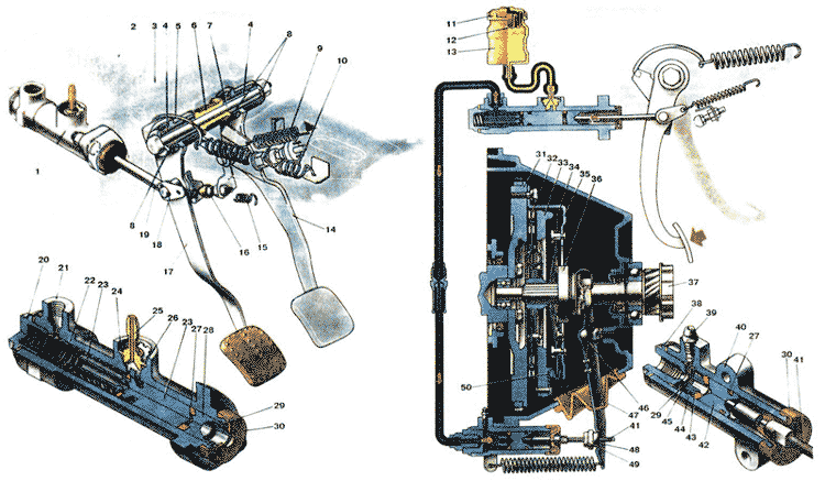 | Выключение сцепления осуществляется через гидравлический привод с подвесной педалью. Этот тип привода обеспечивает плавное включение сцепления, что, в свою очередь, снижает динамические нагрузки на детали трансмиссии и повышает комфортабельность при вождении автомобиля, гидравлический привод надежен и долговечен, трудоемкость технического обслуживания его сведена до минимума привод включена сервопружина 10, значительно снижающая усилие выключения сцепления. Педали сцепления и тормоза подвешены к кронштейну 3 на одной оси 7. выполненной в виде 6олта. Под его головку установлена упорная шайба, а на его конец навертывается гайка с пружинной шайбой. В ступицах педалей остановлены наружные пластмассовые втулки 8, которые не требуют смазки в процессе эксплуатации автомобиля. Поворот педалей происходит на внутренних металлических втулках 4, надетых на ось. Между педалью тормоза и щекой кронштейна установлена дистанционная пластмассовая втулка. Педаль сцепления шарнирно соединена с толкателем 19 и пластиной 18 оттяжной пружины. Они удерживаются на пальце шплинтом. Оттяжная пружина 15 удерживает педаль сцепления в исходном положении, при котором педаль упирается в колпачок ограничителя 16 хода педали. Другой конец толкателя входит в гнездо поршня 28 главного цилиндра. Ограничителем хода педали можно регулировать зазор между полусферическим концом толкателя и поршнем 28. К верхнему концу педали приварен кронштейн, в вырез которого заходит крючок 5, другой конец крючка соединен с сервопружиной 10. Сервопружина стремится повернуть верхнюю часть педали в сторону выключения сцепления, чем значительно снижает усилие, прикладываемое к педали сцепления. Главный цилиндра привода выключения сцепления крепится на двух шпильках к торцевой пластине кронштейна педалей тормоза и сцепления. 6 полости главного цилиндра установлены возвратная пружина 22 и *рва поршня 23 и 28.Пружина опирается одним концом в пробку 20, другим в буртик поршня 23 и служит для возвращения поршней в исходное положение. За счет установки двух поршней уменьшаются радиальные нагрузки на поршень 23 при воздействии толкателя 19на поршень 28, а также улучшается уплотнение поршней, так как между ними сжимается уплотни- тельное кольцо 27. Поршень главного цилиндра уплотнен резиновым кольцом, которое расположено в канавке поршня и создает герметичность в рабочей полости цилиндра. Чтобы по мере возрастания давления в рабочей полости одновременно улучшалось уплотнение поршня, в его хвостовике выполнен осевой канал, соединяющийся с радиальными отверстиями, которые выходят в канавку уплотнительного кольца. Когда давление в рабочей полости цилиндра возрастает, то под его воздействием уплотни- тельное кольцо распирается по радиусу, т. е. плотнее прилегает к зеркалу цилиндра. Одновременно уплотнительное кольцо является клапаном, через который полость цилиндра сообщается с бачком 13. Это происходит при крайнем заднем положении поршней главного цилиндра, когда уплотнительное кольцо не перекрывает компенсационное отверстие. 6се детали главного цилиндра удерживаются в полости стопорным кольцом 29. Защитный колпачок 30 предохраняет полость цилиндра от загрязнения. В отверстиях корпуса цилиндра закреплены трубопровод, отводящий жидкость от главного цилиндра к рабочему, и штуце