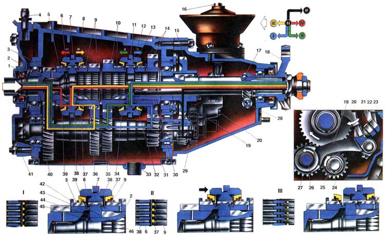 | Принцип работы шестеренчатой коробки передач основан на изменении зацепления тех пар шестерен, которые участвуют в передаче крутящего момента от первичного вала 1 на вторичный вал 2. Это достигается перемещением скользящих муфт 6 и 13 синхронизаторов или промежуточной шестерни 27 заднего хода при помощи рычага переключения передач. При этом изменяются передаточные числа шестерен, а значит и величина передаваемого крутящего момента. На прямой четвертой передаче крутящий момент, передаваемый на ведущие колеса автомобиля, практически равен крутящему моменту на коленчатом валу двигателя. На первой передаче момент увеличивается в 3,75 раза, на второй в 2,30 раза, на третьей в 1,49 раза, а при включении задней передачи в 3,87 раза. При нейтральном положении рычага переключения передач крутящий момент на вторичный вал не передается. Но так как двигатель работает и сцепление включено, то вращение от первичного вала 1 передается на промежуточный вал через шестерни 3 и 40 постоянного зацепления. От шестерен 31, 35 и 36 промежуточного вала вращение передается на шестерни 14, 10 и 9 вторичного вала. Так как эти шестерни с валом 2 непосредственно не связаны, то они будут свободно вращаться на вторичном валу. Соединение этих шестерен с валом 2 осуществляется через синхронизаторы. При включении первой передачи усилие от рычага переключения передач через шток и вилку И передается на скользящую муфту 13. Перемещаясь по шлицам своей ступицы 12, муфта входит в зацепление с прямозубым венцом шестерни 14. Таким образом, муфта синхронизатора соединит между собой ступицу 12 и шестерню 14. А так как ступица 12 жестко связана с валом 2, то крутящий момент от шестерни 14 через муфту 13 передается на ступицу 12 и от нее на вторичный вал коробки передач. При включении второй передачи муфта 13 соединим ступицу 12 с прямозубым венцом шестерни 10, и крутящий момент передается от шестерни 10 на ступиц 12 и на вторичный вал. Третья и четвертая передачи включаются другим синхронизатором. При включении третьей передачи крутящий момент от первичного вала через шестерни 36 и 9 передается через муфту 6 на ступицу 38 и затем на вторичный вал. Четвертая передача называется прямой, так как крутящий момент передается непосредственно с первичного вала 1 на вторичный вал 2, минуя шестерни промежуточного вала. В этом случае муфта 6 соединяет между собой зубчатый венец 5 первичного вала со ступицей 38. Частота вращения обоих валов будет одинаковой, а величина крутящего момента, передаваемого от двигателя на ведущие колеса, не изменится. При включении задней передачи усилие от рычага переключения передач через шток 20 и вилку 19 передается на промежуточную шестерню 27. Перемещаясь на оси 26, она соединит между собой шестерни 25 и 15 заднего хода, и крутящий момент передается от первичного вала через шестерни 5 и 40 на промежуточный вал и далее через шестерни 25, 27 и 15 на вторичный вал. При этом последний будет вращаться в обратном направлении, обеспечивая обратное вращение ведущих колес автомобиля. Как видно из схемы работы коробки передач, все передачи переднего хода синхронизированы. Принцип действия синхронизатора при включении третьей передачи показан на схемах 1, 11, III. При нейтральном положении рычага переключения передач (см. схему 1) между скользящей муфтой 6 и блокирующими кольцами 37 имеется зазор. Блоки