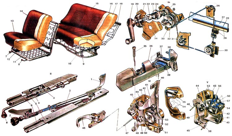 | Передние сиденья раздельные с индивидуальной регулировкой положения сиденья и наклона спинки - Каждое сиденье установлено на салазки, по которым перемещается вперед и назад в пределах 175.5 мм, а при раскладывании в спальное положение - в пределах 255 мм. Салазки сидений состоят из направляющих 6 и ползунов 5, отштампованных из листовой стали. Ползуны могут перемещаться по направляющим на двух роликах 3 каждый. В каналы между стенками ползунов и направляющих вложены по два шарика 4 с каждой стороны с натягом до 0.3 мм. Шарики предотвращают смещение салазок вверх и в стороны. Рукоятка 8 перемещения сиденья жестко связана с защелкой, которая под действием пружины входит в один из пазов гребенки фиксатора, приваренного к направляющей салазок. При нажатии рукоятки 8 вниз освобождается защелка, и сиденье может быть передвинуто в нужное положение. Салазки сидений крепятся к кронштейнам, приваренным к полу кузова. Спинка сиденья имеет грубую и тонкую регулировку угла наклона. Механизм регулирования наклона спинки состоит из винта 7 с рукояткой и тяги, пружины 2, усилителя 1 спинки и фиксатора, приваренного к передней части каркаса 12 подушки. Винт 7 ввернут в торец тяги. На резьбовом участке винта имеется цилиндрическая проточка, в которую через паз вставлен шплинт. Шплинт препятствует полному выворачиванию винта из тяги. На винте между рукояткой и резьбой имеются кольцевые проточки, которые входят в зацепление с зубьями фиксатора. Если рукоятку винта поднять вверх (грубая регулировка наклона спинки), винт выходит из зацепления с фиксатором; пружина 2 при этом перемещает винт с тягой относительно фиксатора назад, а спинку - вперед. Водитель или пассажир могут отжать спинку назад в нужное положение. При вращении рукоятки (тонкая регулировка) винт удерживается фиксатором на месте, а тяга перемещает спинку сиденья за усилитель 1. Каркасы подушки 13 и спинки, 14 сиденья состоят из тонких штампованных и проволочных металлических рамок. К рамкам каркаса 12 подушки с помощью металлических скоб крепятся проволочные пружины И. согнутые в виде змеек. Для избежания скрипа скобы и концы пружин покрыты слоем полиэтилена. Пружины спинки соединяются с каркасом специальными пластмассовыми держателями. На каркас подушки и спинки сиденья установлены набивки из вспененного пенополиуретана. На автомобилях первых выпусков набивка спинки изготавливалась из очесав кокосовых пальм. Обивка сидений из искусственной кожи на трикотажной основе с подложкой из синтетической свариваемой ваты для получения четких декоративных рисунков. Большая часть передних сидений закрыта пластмассовыми облицовками. Заднее сиденье состоит из отдельной спинки и подушки. Подушка двумя отверстиями 9 устанавливается на шипы, приваренные к поперечине пола. Спинка сиденья в верхней части крепится двумя планками, входящими в скобы, которые приварены к полке задка; внизу спинка крепится двумя язычками, которые приварены к аркам колес и загнуты на скобы нижних углов каркаса спинки. Каркасы подушки и спинки также состоят из рамок и пружин. Скобы пружин покрыты поливинилхлоридной пленкой. На каркас подушки установлена набивка из пенополиуретана с подложкой 10. Набивка 17 спинки выполнена из растительных прорезиненных волокон. Заднее сиденье автомобиля ВАЗ-2102 для увеличения площади гр