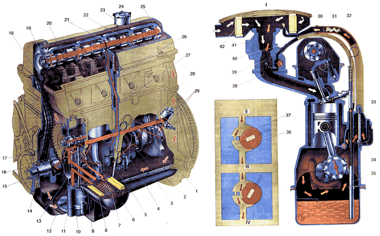 | Система смазки двигателя комбинированная: под давлением и разбрызгиванием. Под давлением смазываются коренные и шатунные подшипники, опоры распределительного вала, втулки шестерни и валика привода масляного насоса и распределителя зажигания. Маслом, вытекающим из зазоров и разбрызгиваемым движущимися деталями, смазываются стенки цилиндров, поршни с поршневыми кольцами, поршневые пальцы в бобышках поршня, цепь привода газораспределительного механизма, опоры рычагов привода клапанов, а также стержни клапанов в их направляющих втулках. Вместимость системы смазки 3,75 л. Уровень масла контролируется по меткам на указателе 5. Нормальное давление масла 0,35-0,45 Мпа (3.5-4,5 кгс/см*) при частоте вращения коленчатого вала 5600 об/мин. Минимальное давление должно быть не менее 0,08 МПа (0.8 кгс/см') В систему смазки входят: масляный насос 10, приемный патрубок с фильтрующей сеткой, прикрепленный к корпусу насоса, полнопоточный масляный фильтр 6, установленный на левой передней стороне двигателя; редукционный клапан давления масла, встроенный в приемный патрубок, датчики 29 указателя и контрольной лампы давления масла. Циркуляция масла при работе двигателя происходит следующим образом. Масляный насос 10, приводимый в движение парой шестерен с винтовыми зубьями, засасывает масло из картера через фильтрующую сетку приемного патрубка и подает его по каналу 11 в полнопоточный фильтр 6. Отфильтрованное масло по каналу 12 попадает в продольный магистральный канал 28, проходящий вдоль блока с левой стороны, а оттуда по каналам 16, просверленным в перегородках блока цилиндров, подводится к коренным подшипникам коленчатого вала. К центральной опоре распределительного вала масло подводится по каналам, просверленным в блоке цилиндров 27, в головке цилиндров 26 и в корпусе подшипников распределительного вала. В прокладке головки цилиндров имеется окантованное медью отверстие, по которому масло проходит из канала 27 блока в канал 26 головки. В каждом вкладыше первого, второго, четвертого и пятого коренных подшипников имеется по два отверстия, через которые масло попадает в кольцевые канавки на внутренних поверхностях вкладышей. Из канавок часть масла идет на смазывание коренных подшипников, а другая часть по каналам 2. просверленным в шейках и щеках коленчатого вала, к шатунным подшипникам, и от них через отверстия в нижних головках шатунов струя масла попадает на зеркала цилиндров в момент совпадения отверстия подшипника с каналом в шатунной шейке. С 1990 г. шатуны изготавливаются без отверстия в нижней головке, и масло от нее на стенки цилиндра не подается. Масло, прошедшее к центральной опоре распределительного вала через кольцевую выточку 21 в опорной шейке, попадает в магистральный канал 20 распределительного вала, а из канала через отверстия в кулачках и опорных шейках к рабочим поверхностям кулачков, рычагов и опор вала. Масло от первого подшипника валика 17 привода масляного насоса и распределителя зажигания поступает по каналу, просверленному в самом валике, ко второму подшипнику. К втулке шестерни привода масляного насоса и распределителя зажигания масло подводится по отдельному каналу 13 из полости перед масляным фильтром. Остальные детали смазываются разбрызгиванием и самотеком. Масляный насос (см. рис. 4) - шестеренчатого типа, установлен внутри