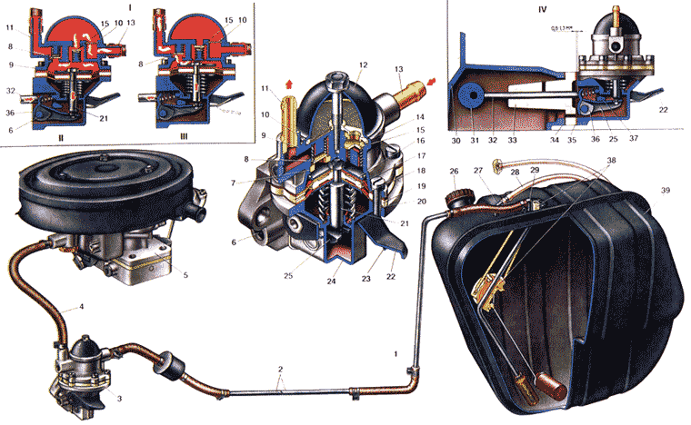 1. Задняя трубка топливного трубопровода; 2. Передняя трубка топливного трубопровода; 3. Топливный насос; 4. Шланг от топливного насоса к карбюратору; 5. Карбюратор; 6. Ось рычага механической подачи топлива; 7. Седло нагнетательного клапана; 8. Нагнетательный клапан; 9. Верхний корпус насоса; 10. Фильтр; 11. Нагнетательный патрубок; 12. Крышка насоса; 13. Всасывающий патрубок; 14. Седло всасывающего клапана; 15. Всасывающий клапан; 16. Тарелка диафрагмы; 17. Внутренняя дистанционная прокладка; 18. Верхние диафрагмы; 19. Наружная дистанционная прокладка; 20. Нижняя диафрагма; 21. Шток; 22. Рычаг ручной подкачки топлива; 23. Пружина рычага; 24. Нижний корпус насоса; 25. Балансир; 26. Пробка топливного бака; 27. Воздушная трубка топливного бака; 28. Шланг сообщения топливного бака с атмосферой; 29. Приемная труба; 30. Блок цилиндров; 31. Эксцентрик валика привода масляного насоса и распределителя зажигания; 32. Толкатель; 33. Теплоизоляционная проставка топливного насоса; 34. Прокладка теплоизоляционной проставки; 35. Прокладка топливного насоса; 36. Рычаг механического привода насоса; 37. Кулачок; 38. Датчик указателя уровня топлива; 39. Топливный бак; 40. I.Схема работы топливного насоса; 41. II.Схема установки топливного насоса.