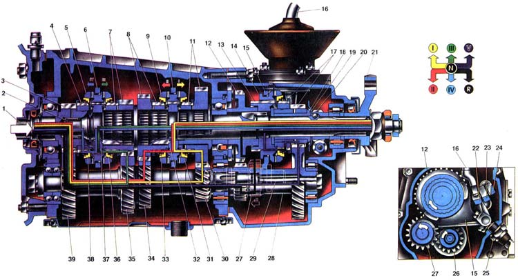 | Пятиступенчатая коробка передач создана на базе четырехступенчатой коробки, поэтому схемы передачи крутящего момента с первичного вала на вторичный на всех передачах переднего хода, за исключением пятой передачи и заднего хода, аналогичны с четырехступенчатой коробкой передач. То есть крутящий момент от коленчатого вала двигателя через сцепление передается на первичный вал 1 и через шестерни 3 и 39 постоянного зацепления на промежуточный вал. Блок шестерен промежуточного вала имеет постоянное зацепление с шестернями 7, 8, 11 третьей, второй и первой передач вторичного вала. Поэтому они вращаются от промежуточного вала как при включенной, так и при выключенной передаче. Кроме того, вместе с промежуточным валом вращается блок 28 шестерен, от большого венца которого вращение передается на шестерню 17 пятой передачи. Так как шестерни 7, 8, 11, 17 свободно посажены на вторичном валу 2, то при нейтральном положении рычага переключения передач ни одна из этих шестерен не передает крутящий момент на вторичный вал. При трогании автомобиля с места и преодолении тяжелых участков дороги включается 1 передача (см. схему перемещения рычага 16 переключения передач). При этом скользящая муфта 9, входя в зацепление с зубчатым венцом синхронизатора шестерни 11 первой передачи, соединяет ступицу 32 с шестерней 11. Крутящий момент от шестерни 11 через муфту 9 и ступицу 32 передается на вторичный вал 2. Передаваемый крутящий момент увеличивается в соответствии с передаточным числом первой передачи. При дальнейшем разгоне автомобиля переходят с первой передачи на вторую. В этом случае муфта 9 соединяет ступицу 32 с зубчатым венцом шестерни 8 второй передачи, и крутящий момент от шестерни 8 через муфту 9 и ступицу 32 передается на вторичный вал. Величина крутящего момента несколько снижается и по сравнению с прямой передачей будет увеличена в 2,1 раза, скорость автомобиля увеличивается. При переходе на третью передачу скользящая муфта 5 другого синхронизатора соединяет ступицу 37 с венцом шестерни 7. Крутящий момент передается от шестерни 7 через муфту 5 и ступицу 37 на вторичный вал 2. Величина крутящего момента несколько снижается, а скоробь увеличивается. При включении четвертой передачи муфта 5 входит в зацепление с зубчатым венцом 4 ведущего вала, т. е. соединяет напрямую первичный и вторичный валы коробки передач. В этом случае частота вращения первичного и вторичного валов будет одинаковой, и величина крутящего момента не изменяется. Эта передача называется прямой. При включении пятой передачи скользящая муфта 14 соединяет ступицу 13 с зубчатым венцом шестерни 17. Крутящий момент будет передаваться от первичного вала 1 через шестерни постоянного зацепления 3 и 39 на промежуточный вал. От него на блок 28 шестерен и от большого венца блока на ведомую шестерню 17 пятой передачи, затем через муфту 14 и ступицу 13 на вторичный вал 2. При этом величина крутящего момента будет минимальной, а скорость максимальной. Задняя передача включается перемещением рычага переключения передач вправо, затем нажатием на него вниз и перемещением назад по ходу автомобиля. При этом промежуточная шестерня 27 заднего хода входит в зацепление с малым венцом 26 блока шестерен и с венцом шестерни 12 заднего хода. При перемещении промежуточной шестерни 27 головка штока нажимает на шарик штока вкл