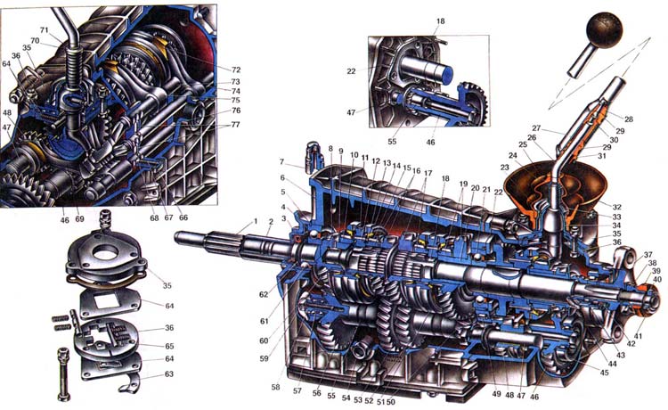 | На автомобилях ВАЗ-21065, а по заказу и на ряде автомобилей ВАЗ-2106. устанавливается пятиступенчатая коробка передач. Она создана на базе четырехступенчатой коробки и отличается по внешнему виду формой задней крышки, в полости которой на конце ведомого вала размещена пятая ступень. Введение дополнительной пятой передачи расширило диапазон скоростей движения автомобиля, за счет чего достигается работа двигателя на наиболее экономичных режимах, а также улучшаются условия работы двигателя. Это, в свою очередь, увеличивает долговечность его работы. Передаточные числа одноименных передач у пятии четырехступенчатой коробок одинаковые. Передаточное число пятой передачи - 0.82. В связи с тем, что пятиступенчатая коробка передач сконструирована на базе четырехступенчатой коробки, многие ее детали имеют одинаковое устройство и взаимозаменяемы. Коробка передач так же трехвальная, то есть состоит из первичного 1, вторичного 18 и промежуточного 55 валов. Первичный вал идентичен с валом четырехступенчатой коробки. Вторичный вал отличается своей задней частью, на которой расположены детали пятой ступени. Промежуточный вал отличается тем, что в заднем торце имеет резьбовое отверстие для болта крепления блока 46 шестерен пятой передачи и заднего хода. Ведомые шестерни 16, 17, 19 третьей, второй и первой передач, детали синхронизаторов, подшипники валов унифицированы с одноименными деталями четырехступенчатой коробки передач. Таким образом, конструкция деталей, расположенных в полости картера коробки, одинакова с четырехступенчатой коробкой (см. рис. 15). Детали пятой передачи и заднего хода расположены в полости задней крышки. Вместе с ведомой шестерней 12 (см. рис. 18) заднего хода на ведомом валу 2 одной шпонкой крепится ступица 13 муфты 14 синхронизатора пятой передачи. За ступицей 13 расположена упорная шайба и втулка 18, на которой вращается шестерня 17 пятой передачи. Между втулкой шестерни 17 и ведущей шестерней 20 привода спидометра зажата маслоотражательная шайба 19. Она уменьшает выброс масла в сторону сальника 42 , улучшая условия его работы. Задний конец вторичного вала вращается на роликовом цилиндрическом подшипнике 43, т.к. нагрузка на задний конец вала увеличилась. На шлицах вала крепится фланец 37 эластичной муфты. Все детали, расположенные на вторичном валу, поджимаются гайкой 38, которая фиксируется стопорной шайбой. На цилиндрическом пояске гайки расположен резиновый уплотнитель 39, а на конце вала центрирующее кольцо 40 и ее стопорное кольцо. На шлицах промежуточного вала 55 крепится стяжным болтом блок46 шестерен пятой передачи и заднего хода. Задней опорой для блока шестерен является роликовый цилиндрический подшипник 45. Блок шестерен имеет два венца. Большой венец находится в постоянном зацеплении с ведомой шестерней пятой передачи. С малым венцом входит в зацепление промежуточная шестерня 48 при включении задней передачи. Промежуточная шестерня 48 расположена на оси 47, которая крепится в перегородке картера коробки гайкой с тарельчатой пружинной шайбой. Другой конец оси опирается в гнездо задней крышки. Привод переключения передач также незначительно отличается от привода четырехступенчатой коробки. Изменена конструкция штока 76 и вилки 69 включения задней и пятой передач. На штоке 76 крепится стопорным болтом двойная вилка 69 од