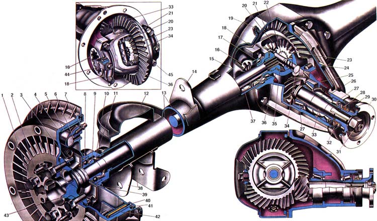 | Крутящий момент от карданной передачи передается на ведущие колеса автомобиля через главную передачу, дифференциал и полуоси. Эти механизмы установлены в заднем мосту автомобиля, который состоит из двух базовых деталей: балки 13 и картера 24 редуктора заднего моста. Балка 13 заднего моста состоит из двух штампованных кожухов, сваренных продольными швами. К. концам кожухов приварены два стальных фланца 10, в которых проточены гнезда для подшипников 8 и сальников 11 полуосей. С торца во фланцах выполнены отверстия для болтов крепления щитов 40 тормозных механизмов колес. Эти же болты с гайками крепят маслоотражатель 3 и пластину 39, которая удерживает в гнезде фланца подшипник полуоси. Пластина крепления подшипника полуоси и маслоотражатель соединены между собой винтами через уплотнительную прокладку. На концах балки заднего моста приварены опорные чашки пружин задней подвески и кронштейны для крепления штанг и амортизаторов подвески. В средней части балка расширена и имеет сквозной проем, к задней стороне которого приварена штампованная крышка с расположенным в ней маслоналивным (одновременно и контрольным) отверстием, закрытым пробкой. К переднему обработанному торцу проема крепится болтами картер 24 редуктора заднего моста. Сверху в балку ввернут сапун 19 с подпружиненным клапаном. Через сапун полость балки сообщается с атмосферой, что исключает повышение давления в полости балки и попадание в задний мост воды и грязи при преодолении водных преград. Внутри балки приварены направляющие 15 полуосей, облегчающие установку полуосей при сборке заднего моста. В нижней части балки расположено отверстие для слива масла. Оно закрыто пробкой с магнитом. Главная передача состоит из пары конических шестерен 33 и 21, передаточное число которых равно 4,1 (число зубьев у шестерни 21 41, а у шестерни 33 10). Шестерни имеют гипоидное зацепление, при котором ось ведущей шестерни 33 смещена относительно оси шестерни 21, т. е. их оси не пересекаются, а перекрещиваются. Такие шестерни имеют сложную форму зуба, которая обеспечивает одновременное и плавное зацепление нескольких зубьев. Это уменьшает нагрузку на каждый зуб, увеличивает долговечность работы главной передачи и позволяет передавать больший крутящий момент. Однако такая передача требует специального масла (ТАД17и) с противозадирными присадками. Шестерня 33 установлена на двух роликовых конических подшипниках 27, между внутренними кольцами которых расположена распорная втулка 26. Между внутренним подшипником и торцом шестерни установлено регулировочное кольцо 25, толщина которого находится в пределах от 2,55 до 3,35 мм через каждые 0,05 мм. Семнадцать размеров регулировочного кольца позволяют с большой точностью регулировать взаимное положение ведущей и ведомой шестерен, обеспечивающее правильное зацепление их зубьев. На шлицевой конец шестерни 33 надет фланец 30, который крепится самоконтрящейся гайкой 31. К цилиндрической поверхности фланца поджимается рабочая кромка сальника 28. Он защищен от повреждений грязеотражателем 29. Между подшипником шестерни и фланцем зажат маслоотражатель 32. Для того чтобы ограничить осевое перемещение ведущей шестерни под рабочими нагрузками и обеспечить бесшумную и долговечную работу главной передачи, в подшипниках 27 шестерни устанавливается предварительн