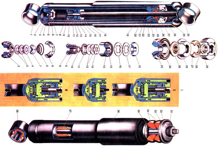 1. Нижняя головка; 2. Корпус клапана сжатия; 3. Диски клапана сжатия; 4. Дроссельный диск клапана сжатия; 5. Пружина клапана сжатия; 6. Обойма клапана сжатия; 7. Тарелка клапана сжатия; 8. Гайка клапана отдачи; 9. Пружина клапана отдачи; 10. Поршень амортизатора; 11. Тарелка клапана отдачи; 12. Диски клапана отдачи; 13. Кольцо поршня; 14. Шайба гайки клапана отдачи; 15. Дроссельный диск клапана отдачи; 16. Тарелка перепускного клапана; 17. Пружина перепускного клапана; 18. Ограничительная тарелка; 19. Резервуар; 20. Шток; 21. Цилиндр; 22. Кожух; 23. Направляющая втулка штока; 24. Уплотнительное кольцо резервуара; 25. Обойма сальника штока; 26. Сальник штока; 27. Прокладка защитного кольца штока; 28. Защитное кольцо штока; 29. Гайка резервуара; 30. Верхняя головка амортизатора; 31. Гайка крепления переднего амортизатора; 32. Пружинная шайба; 33. Шайба подушки; 34. Подушки; 35. Распорная втулка; 36. Кожух амортизатора передней подвески; 37. Буфер штока; 38. Резинометаллический шарнир; 39. Схема работы амортизатора; 40. II.Ход сжатия; 41. Ход отдачи.