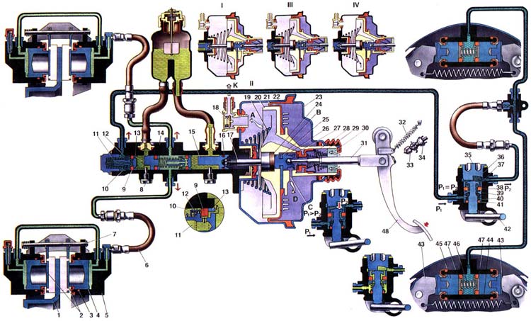 1. Диск тормозного механизма; 2. Тормозная колодка переднего тормоза; 3. Уплотнительное кольцо поршня; 4. Поршень колесного цилиндра; 5. Колесный цилиндр переднего тормоза; 6. Тормозной шланг контура привода передних тормозов; 7. Палец крепления тормозных колодок: 8. Ограничительный винт хода поршня; 9. Уплотнительное кольцо; 10. Упорная чашка; 11. Поршень привода задних тормозов; 12. Пружина уплотнительного кольца; 13. Втулка; 14. Корпус главного цилиндра: 15. Поршень привода передних тормозов: 16. Уплотнитель; 17. Шток; 18. Вакуумный клапан; 19. Возвратная пружина корпуса клапана; 20. Корпус клапана: 21. Диафрагма: 22. Корпус вакуумного клапана; 23. Крышка корпуса вакуумного усилителя; 24. Буфер штока; 25. Упорная пластина поршня; 26. Поршень; 27. Клапан вакуумного усилителя; 28. Пружина клапана; 29. Возвратная пружина клапана; 30. Воздушный фильтр; 31. Толкатель клапана; 32. Оттяжная пружина педали: 33. Наконечник выключателя стоп-сигнала; 34. Выключатель стоп-сигнала; 35. Пробка корпуса регулятора давления; 36. Поршень регулятора давления; 37. Втулка корпуса; 38. Уплотнитель головки поршня: 39. Тарелка пружины; 40. Пружина поршня; 41. Уплотнительное кольцо поршня регулятора давления; 42. Рычаг привода регулятора давления; 43. Колодка заднего тормоза: 44. Стяжная пружина колодок; 45. Поршень колесного цилиндра заднего тормоза; 46. Распорная пружина поршней; 47. Уплотнители поршней колесного цилиндра; 48. Педаль тормоза; 49. А. Вакуумная полость; 50. В. Канал, соединяющий вакуумную полость с внутренней полостью клапана; 51. С. Канал, соединяющий внутреннюю полость клапана с атмосферной полостью; 52. D. Атмосферная полость; 53. К. Шланг. соединяющий вакуумный усилитель с впускной трубой двигателя; 54. I.Педаль не нажата; 55. II.Торможение; 56. III.Нажатие на педаль приостановлено; 57. IV.Растормаживание.