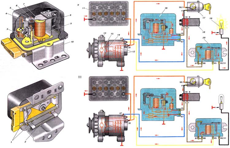 | Регулятор напряжения. Для поддержания напряжения в бортовой сети автомобиля на постоянном уровне 13- 14 В, независимо от оборотов ротора, применяется вибрационный двухступенчатый регулятор напряжения типа РР-380. На части автомобилей устанавливается без- контактный электронный регулятор напряжения типа 121.3702. Он может применяться вместо регулятора РР-ЗВО без каких-либо переделок в схеме электрооборудования автомобиля. Регулятор напряжения РР-380 представляет собой электромагнитное реле. Как у каждого реле такого типа, у него есть магнитная система, состоящая из цилиндрического сердечника и U-образного ярма 9, катушка с обмоткой 6 на пластмассовом каркасе, якорь 7 с подвижным контактом и две стойки 4 и 5 с неподвижными контактами. Пазы в стойках позволяют передвигать их вверх и вниз при регулировке регулятора. Верхний и нижний контакты якоря в сочетании с контактами стоек образуют две пары контактов - верхнюю и нижнюю. Пружиной якорь прижат к контакту верхней стойки. Подгибая нижний кронштейн пружины, можно изменять ее натяжение и этим регулировать величину напряжения, при котором будет размыкаться верхняя пара контактов. Под основанием на изоляционной прокладке находятся термокомпенсирующий 1 и два дополнительных резистора 2 с общим сопротивлением 5,5 Ом. Дроссель 3 служит для уменьшения искрения между верхней парой контактов. Реле контрольной лампы заряда аккумуляторной батареи. Реле 20 типа РС702 предназначено для включения контрольной лампы в комбинации приборов, когда напряжение генератора недостаточно для заряда аккумуляторной батареи. Напряжение размыкания контактов реле при (25+5) "С составляет (5,3+0,4) В, а замыкания 0,0-1,5 В. Сопротивление обмотки равно 29 Ом. Работа системы генератора. В работе системы генератора можно выделить три режима: работа при малой, средней и высокой частоте вращения ротора генератора. 1 Режим. Это режим пуска двигателя, когда он еще не работает или прокручивается стартером. В этом случае потребители питаются от аккумуляторной батареи. На этом режиме после включения зажигания в цепи обмотки возбуждения генератора протекает ток, замыкающийся по пути: "плюс" аккумуляторной батареи - выключателя зажигания 17 - предохранитель "10" штекер "15", сердечник дросселя 3, замкнутые верхние контакты. якорь. ярмо. штекер "67" регулятора штекер "67" генератора - обмотка возбуждения генератора - "масса" - "минус" аккумуляторной батареи. Этот ток создает магнитный поток, который при вращении ротора генератора пересекает витки обмотки статора генератора и наводит в них электродвижущую силу. Одновременно протекает ток через обмотку 6 регулятора напряжения, который создает магнитное притяжение якоря регулятора к сердечнику, но еще не настолько сильное, чтобы притянуть якорь к сердечнику и разомкнуть верхнюю пару контактов регулятора напряжения. Одновременно горит контрольная лампа 19, сигнализируя о том, что все потребители питаются от аккумуляторной батареи. Ток через лампу идет по пути: "+" аккумуляторной батареи выключатель зажигания предохранитель "9" - замкнутые контакты реле 20 контрольная лампа 19 - "масса" - " аккумуляторной батареи. И режим. После пуска двигателя выпрямленное напряжение генератора превышает напряжение аккумуляторной батареи. Обмотка возбуждения генератора и обмотка регулятора напряжения питаются от 