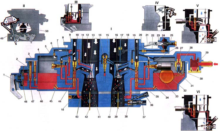 1. Рычаг ускорительного насоса; 2. Винт регулировки подачи топлива ускорительным насосом; 3. Пробка обратного клапана ускорительного насоса; 4. Поплавковая камера; 5. Топливный жиклер переходной системы второй камеры; 6. 6. Воздушный жиклер экономайзера (эконостата); 7. 7. Воздушный жиклер переходной системы; 8. Топливный жиклер экономайзера: 9. Главный воздушный жиклер второй камеры; 10. Эмульсионный жиклер экономайзера; 11. Распылитель экономайзера; 12. Распылитель главной дозирующей системы второй камеры; 13. Малый диффузор второй камеры; 14. Клапан распылителя ускорительного насоса; 15. Распышталь ускорительного насоса; 16. Малый диффузор первой камеры; 17. Воздушная заслонка; 18. Соединительная втулка кацапов карбюратора: 19. Главный воздушный жиклер первой камеры; 20. Воздушный жиклер пускового устройства; 21. Тяга, соединяющая рычаг оси воздушной заслонки с рейкой пускового устройства; 22. Корпус пускового устройства; 23. Рейка пускового устройства: 24. Диафрагма пускового устройства: 25. Регулировочный винт пускового устройства; 26. Воздушный жиклер системы холостого хода; 27. Седло игольчатого клапана; 28. Игольчатый клапан: 29. Топливный фильтр; 30. Кронштейн поплавка с упором и язычком; 31. Шарик демпфера игольчатого клапана; 32. Поплавок; 33. Топливный жиклер системы холостого хода; 34. Главный топливный жиклер первой камеры; 35. Эмульсионная трубка первой камеры; 36. Регулировочный винт состава (качества) смеси холостого хода; 37. Регулировочный винт количества смеси холостого хода; 38. Седло регулировочного винта; 39. Дроссельная заслонка первой камеры: 40. Первая смесительная камера: 41. Вторая смесительная камера: 42. Дроссельная заслонка второй камеры; 43. Нерегулируемые отверстия переходной системы; 44. Эмульсионная трубка второй камеры; 45. Главный топливный жиклер второй камеры; 46. Обратный клапан ускорительного насоса; 47. Перепускной жиклер ускорительного насоса; 48. Диафрагма ускорительного насоса; 49. Жиклер пневмопривода. расположенный во второй камере; 50. Жиклер пневмопривода. расположенный в первой камере; 51. I. Схема работы карбюратора на максимальной мощности двигателя; 52. II.Схема работы пневмопривода дроссельной заслонки второй камеры; 53. III. Схема работы ускорительного насоса: 54. IV. Схема работы пускового устройства; 55. V. Схема работы карбюратора на режимах дросселирования; 56. VI. Схема работы карбюратора на холостом ходу.