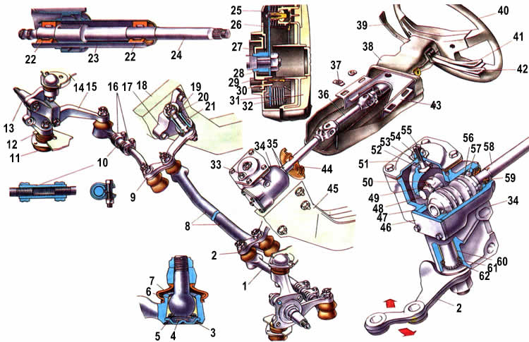 1. Боковая тяга рулевого привода. 2. Сошка. 3. Опорная шайба пружины вкладыша шарового пальца. 4. Пружина вкладыша шарового пальца. 5. Шаровой палец. 6. Вкладыш шарового пальца. 7. Защитный чехол шарового пальца. 8. Средняя тяга рулевого привода. 9. Маятниковый рычаг. 10. Регулировочная муфта боковой тяги. 11. Нижняя шаровая опора передней подвески. 12. Нижний рычаг передней подвески . 13. Правый поворотный кулак. 14. Верхний рычаг передней подвески. 15. Рычаг правого поворотного кулака. 16. Стяжные хомуты регулировочной муфты. 17. Кронштейн маятникового рычага. 18. Правый лонжерон пола кузова. 19. Втулка оси маятникового рычага. 20. Уплотнительное кольцо втулки. 21. Ось маятникового рычага. 22. Игольчатый подшипник верхнего вала. 23. Труба кронштейна крепления вала рулевого управления. 24. Верхний вал рулевого управления. 25. Наконечник провода. 26. Держатель включателя сигнала. 27. Нижнее контактное кольцо. 28. Ступица колеса. 29. Держатель нижнего контактного кольца. 30. Провод от нижнего контактного кольца. 31. Пружина включателя сигнала. 32. Включатель звукового сигнала. 33. Пробка маслоналивного отверстия . 34. Картер рулевого механизма. 35. Метки для установки ролика (сошки) в среднее положение. 36. Промежуточный вал рулевого управления. 37. Фиксирующая пластина передка кронштейна. 38. Облицовочный кожух вала рулевого управления. 39. Рычаг переключателя стеклоочистителя и смывателя. 40. Рулевое колесо. 41. Рычаг переключателя указателей поворота. 42. 42' Рычаг переключателя света фар. 43. Кронштейн крепления вала рулевого упарвления. 44. Уплотнитель вала рулевого управления. 45. Левый лонжерон попа кузова. 46. Нижняя крышка картера рулевого механизма. 47. Регулировочные прокладки. 48. Ось ролика вала сошки. 49. Шариковый подшипник ролика. 50. Ролик. 51. Верхняя крышка картера рулевого механизма. 52. Пластина регулировочного винта. 53. Стопорная шайба. 54. Контргайка. 55. Регулировочный винт. 56. Червяк. 57. Подшипники червяка. 58. Вал червяка. 59. Сальник вал червяка. 60. Втулка вала червяка. 61. Сальник вала сошки. 62. Вал сошки.