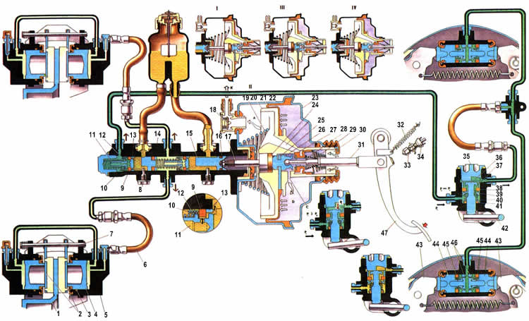 | Когда система расторможена и педаль тормоза под действием пружины 32 оттягивается до упора в выключатель 34 стоп-сигнала, то вместе с педалью оттягивается толкатель 31 с поршнем 26 вакуумного усилителя. Корпус 20 клапана и шток 17 отжаты пружиной 19 в крайнее заднее положение. При таком положении между головкой клапана 27 и седлом клапана образуется зазор, так как поршень отжимает клапан от седла. Вакуумная полость А через канал В, зазор между седлом и клапаном и далее через канал С сообщается с атмосферной полостью D. Поэтому при работающем двигателе разрежение из впускной трубы через клапан 18 передается в полость А и через каналы и зазоры в полость D. Поршни 11 и 15 главного цилиндра под действием возвратных пружин отжаты в заднее крайнее положение до упора в стопорные винты 8, отжимают уплотни- тельные кольца 9 от торца канавки поршня и через образовавшиеся зазоры рабочие полости цилиндра сообщаются с бачком гидроцилиндра и трубопроводами высокого давления. Таким образом, в приводе тормозов давление отсутствует. Поэтому поршни 4 под действием упругой деформации уплотнительных колец 3 отводятся внутрь цилиндров и не оказывают давления на тормозные колодки передних тормозов, которые будут находиться в легком соприкосновении с поверхностью тормозного диска. При движении автомобиля без торможения, то есть когда в гидравлическом приводе нет давления, поршень 36 под действием пружины 40 и торсионного рычага 42 поднят вверх до упора в пробку 35. Поэтому полости корпуса, находящиеся над головкой поршня и под ней, свободно сообщаются. Это открывает свободный проход жидкости к колесным цилиндрам задних тормозов. Но так как нет давления во всем приводе, тормозные колодки 43 отжаты от барабанов. При торможении, когда водитель нажимает на тормозную педаль, толкатель 31 перемещает поршень 26. Вслед за поршнем перемещается под действием пружины 28 клапан 27 до упора в седло корпуса клапана. При перекрытии седла полости А и D разобщаются. При дальнейшем перемещении поршня 26 между ним и буртиком клапана 27 образуется зазор, через который полость D сообщается с атмосферой. Наружный воздух поступает в полость D через воздушный фильтр 30, через зазор между толкателем и клапаном и далее через канал С. Атмосферный воздух создает давление на диафрагму 21. За счет разности давления в полостях А и D, а также силы нажатия на педаль тормоза, корпус клапана перемещается вместе со штоком 17, который в свою очередь воздействует на поршень 15 главного цилиндра. Сила, воздействующая на корпус клапана, зависит от степени разрежения во впускной трубе двигателя и от силы, прикладываемой к педали тормоза. При перемещении поршня 15 распорная втулка 13 отходит от стопорного винта 8 и уплотнительное кольцо 9 прижимается пружиной 12 к торцу канавки поршня. Таким образом, компенсационный зазор перекрывается и происходит разобщение полостей цилиндра и бачка. Поэтому при дальнейшем перемещении поршня 15 в рабочей полости привода передних тормозов создается давление жидкости, которое через трубопроводы и шланги передается к колесным цилиндрам передних тормозов. Оно же воздействует и на плавающий поршень 11, который, перемещаясь, создает давление в приводе задних тормозов. Под увеличивающим давлением жидкости в рабочих полостях передние уплотни- тельные кольца поршней распираются и н