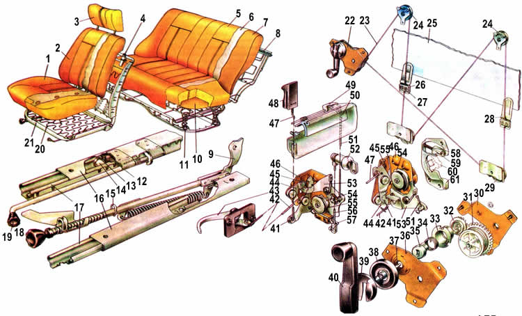 1. Подушка сиденья. 2. Спинка сиденья. 3. Подголовник. 4. Направляющая подголовника. 5. Обивка. 6. Подпорка обивки. 7. Набивка. 8. Каркас спинки заднего сиденья. 9. Усилитель спинки переднего сиденья. 10. Подложка набивки подушки. 11. Отверстие для фиксации подушки сиденья. 12. Ограничитель салазок. 13. Кольцо ролика. 14. Ролик. 15. Шплинт. 16. Ползуны салазок. 17. Направляющие салазок. 18. Винт регулирования наклона спинки. 19. Рукоятка защелки салазок. 20. Пружина подушки. 21. Каркас переднего сиденья. 22. Стеклоподъемник. 23. Трос. 24. Верхний ролик. 25. Опускное стекло. 26. Прижимная пластина. 27. Винт крепления прижимной пластины. 28. Задний кронштейн опускного стекла. 29. Нижний ролик. 30. Корпус стеклоподъемника. 31. Барабан с ведомой шестерней. 32. Ведущая шестерня. 33. Опора ведущего валика. 34. Пружина тормоза. 35. Поводок пружины тормоза. 36. Крышка корпуса стеклоподъемника. 37. Ведущий валик. 38. Розетка. 39. Облицовка ручки. 40. Ручка стеклоподъемника. 41. Рычаг блокировки замка. 42. Тяга внутреннего привода замка. 43. Внутренняя ручка двери. 44. Рычаг внутреннего привода замка. 45. Пружина рычага блокировки. 46. Корпус замка. 47. Тяга кнопки. 48. Кнопка блокировки замка. 49. Поводок тяги наружного привода замка. 50. Наружная ручка замка. 51. Тяга наружного привода. 52. Выключатель замка двери. 53. Рычаг наружного привода. 54. Храповик замка. 55. Пружина. 56. Тяга выключателя замка. 57. Валик выключения замка. 58. Пружина сухаря. 59. Сухарь фиксатора. 60. Ротор замка. 61. Корпус фиксатора замка.