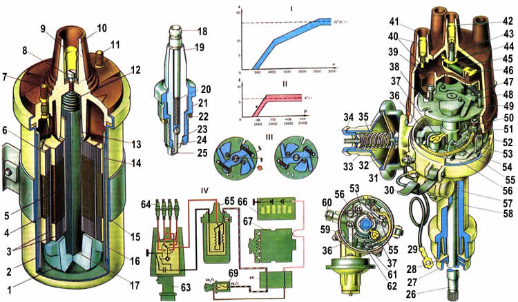 1. Изолятор; 2. Корпус катушки зажигания; 3. Изоляционная бумага обмоток; 4. Первичная обмотка; 5. Вторичная обмотка; 6. Изоляционная трубка первичной обмотки; 7. Клемма вывода конца первичной обмотки: 8. Контактный винт; 9. Клемма высокого напряжения; 10. Крышка; 11. Клемма "+E" вывода начала первичной и конца вторичной обмоток; 12. Пружина центральной клеммы; 13. Каркас вторичной обмотки: 14. Наружная изоляция первичной обмотки; 15. Скоба крепления; 16. Наружный магнитопровод; 17. Сердечник; 18. Контактная гайка; 19. Изолятор свечи зажигания: 20. Стержень; 21. Корпус свечи; 22. Уплотнительное кольцо; 23. Теплоотводящая шайба; 24. Центральный электрод; 25. Боковой электрод свечи зажигания; 26. Валик распределителя зажигания; 27. Маслоотражательная муфта валика; 28. Шайба: 29. Провод подвода тока и распределителю; 30. Запорная пружина крышки; 31. Корпус вакуумного регулятора; 32. Диафрагма; 33. Крышка вакуумного регулятора; 34. Гайка; 35. Пружина вакуумного регулятора; 36. Тяга вакуумного регулятора; 37. Смазочный фитиль (фильц) кулачка; 38. Опорная пластина регулятора опережения зажигания; 39. Ротор распределителя зажигания: 40. Боковой электрод с клеммой; 41. Крышка распределителя зажигания; 42. Центральный электрод с клеммой; 43. Уголек центрального электрода; 44. Центральный контакт ротора; 45. Резистор 5-6 ком для подавления радиопомех; 46. Наружный контакт ротора; 47. Пружина регулятора опережения зажигания; 48. Пластина центробежного регулятора; 49. Грузик регулятора опережения зажигания; 50. Изоляционная втулка; 51. Кулачок прерывателя; 52. Изоляционная колодка рычажка: 53. Рычажок прерывателя; 54. Стойка с контактами прерывателя; 55. Контакты прерывателя; 56. Подвижная пластина прерывателя; 57. Конденсатор 0,20-0,25 мкФ; 58. Корпус распределителя зажигания; 59. Подшипник подвижной пластины прерывателя; 60. Корпус масленки; 61. Винт клеммового зажима; 62. Стопорная пластина подшипника: 63. Распределитель зажигания; 64. Свечи зажигания; 65. Выключатель зажигания; 66. Катушка зажигания; 67. Генератор; 68. Аккумуляторная батарея; 69. Датчик-распределитель зажигания; 70. Коммутатор; 71. Угол опережения зажигания; 72. К источникам питания: 73. I.Катушка зажигания; 74. I.Свеча зажигания; 75. III.Распределитель зажигания; 76. IV.Схема классической системы зажигания; 77. V.Схема работы центробежного регулятора опережения зажигания. 78. VI.Схема бесконтактной системы зажигания.