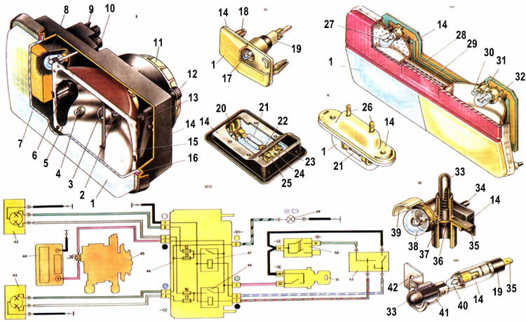1. Рассеиватель. 2. Лампа AKn2-60+55 фары. 3. Экран лампы. 4. Лампа А12-4 габаритного света. 5. Оттяжная пружина. 6. Упор. 7. Рассеиватель указателя поворота. 8. Лампа AI2-21-3 указателя поворота. 9. Гнездо для присоединения гидрокорректора фар. 10. Бинт для регулирования пучка света фары в вертикальном направлении. 11. Кожух. 12. Винт для регулирования пучка света фары в горизонтальном направлении. 13. Кронштеин 14. Корпус. 15. Рефлектор. 16. Клей для приклеивания и герметизации рассеивателя. 17. Лампа А12-4 18. Держатель. 19. Держатель штекеров с патроном лампы. 20. Стоика-штекер для подвода напряжения и крепления лампы. 21. Лампа АС12-5. 22. Стойка лампы. 23. Штекер для соединения с массой. 24. Выключатель. 25. Штекер для соединения с выключателями. расположенными в стойках дверей. 26. Штекеры- держатели лампы. 27. Лампа AI2-21-3 противотуманного света. 28. Лампа А12-4 габаритного света. 29. Печатная плата. 30. Катафот . 31. Лампа AI2-21-3 сигнала торможения. 32. Держатель печатной платы. 33. Кнопка. 34. Болт крепления лампы. 35. Штекер для подвода напряжения. 36. Контактная шайба. 37. Опорный штифт пружины. 38. Лампа А12-5. 39. Экран. 40. Лампа АМН12-3. 41. Направляющая кнопки. 42. Кронштейн крепления лампы. 43. Блок-фары. 44. Аккумуляторная батарея. 45. Генератор. 46. Монтажный блок. 47. Репе включения дальнего света фар. 48. Реле включения ближнего света фар. 49. Спидометр с контрольной лампой дальнего света фар. 50. Выключатель наружного освещения. 51. Выключатель зажигания. 52. Переключатель света фар. 53. I.Блок-фара . 54. I.Боковой указатель поворота. 55. III.Задний фонарь . 56. IV.ГТпафон освещения салона . 57. V.Фонарь освещения номерного знака . 58. VI.Подкапотная лампа . 59. VII.Лампа освещения вещевого ящика. 60. VIII.Электрическая схема включения фар.