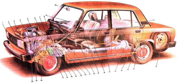 | В альбоме описана и наглядно показана конструкция легковых автомобилей ВАЗ-2105 и ВАЗ2104. выпускаемых Акционерным обществом "АВТОВАЗ". Модель ВАЗ-2105 представляет собой модернизацию известной модели легкового автомобиля ВАЗ-21011. Модернизация была направлена на придание автомобилю более современной внешности, на повышение его комфортабельности, активной и пассивной безопасности. экономичности с одновременным снижением воздействия автомобиля на окружающую среду Автомобили ВАЗ-2105 и ВАЗ-2104 отвечают всем требованиям по ) безопасности Европейской Экономической комиссии ООН. Компоновка (расположение узлов и агрегатов) автомобилей выполиена по так называемой классической схеме, т.е. двигатель расположен спереди, а ведущими являются задние колеса. Двигатель максимально продвинут вперед, что обеспечивает оптимальное распределение массы по осям, а следовательно, хорошую устойчивость автомобиля на дороге. Такое расположение двигателя позволяет иметь просторный салон для пассажиров при заданной колесной базе. Хорошая комфортабельность автомобилей, которая также является одним из факторов безопасности, достигнута за счет легкости и удобства управления, хорошей обзорности с места водителя, малой шум Насти в салоне, минимальным влиянием колебаний и вибраций кузова и эффективной вентиляцией салона. Кроме того. форма и мягкость сидений, возможность регулировки их расположения и угла наклона спинки. а также удобное размещение органов управления улучшают условия работы водителя и снижают его утомляемость. Повышает комфортабельность автомобилей (особенно при езде по дорогам с плохим покрытием) и тот фактор, что салон расположен внутри базы. т.е. в зоне наилучшей плавности хода. Автомобили, оснащенные буксирным устройством, могут быть использованы для работы с прицепом, имеющим тягово-сцепное устройство шарового типа. Допустимая полная масса буксируемого прицепа с тормозами составляет 750 кг. а прицепа без тормозов 500 кг. Двигатель Двигатель 6. установленный на автомобилях, четырехтактный. карбюраторный, рядный, с верхним расположением распределительного вала. Применение зубчатого ремня в приводе распределительного вала и хорошо заглушенный воздушный фильтр заметно снизили шумНасть работы двигателя. Система смазки двигателя комбинированная: под давлением смазываются подшипники коленчатого и распределительного валов и вала привода вспомогательных агрегатов, разбрызгиванием - цилиндры и механизм газораспределения. Система вентиляции картера закрытого типа. В системе имеются маслоотделитель и пламегаситель. Система питания двигателя включает воздушный фильтр 5 с терморегулятором. двухкамерный карбюратор с падающим потоком. диафрагменный топливный насос 29 с рычагом ручной подкачки топлива и топливный бак Карбюратор "Озон", снабженный системой экономайзера принудительного холостого хода с электронным управлением. и распределитель зажигания с центробежным и вакуумным регуляторами опережения зажигания обеспечивают снижение расхода топлива и меньшую токсичность отработавших газов. Система охлаждения двигателя жидкостная, закрытого типа, с полупрозрачным (для визуального контроля уровня жидкости) расширительным бачком. Привод центробежного насоса и вентилятора осуществляется клиновым ремнем от шкива коленчато